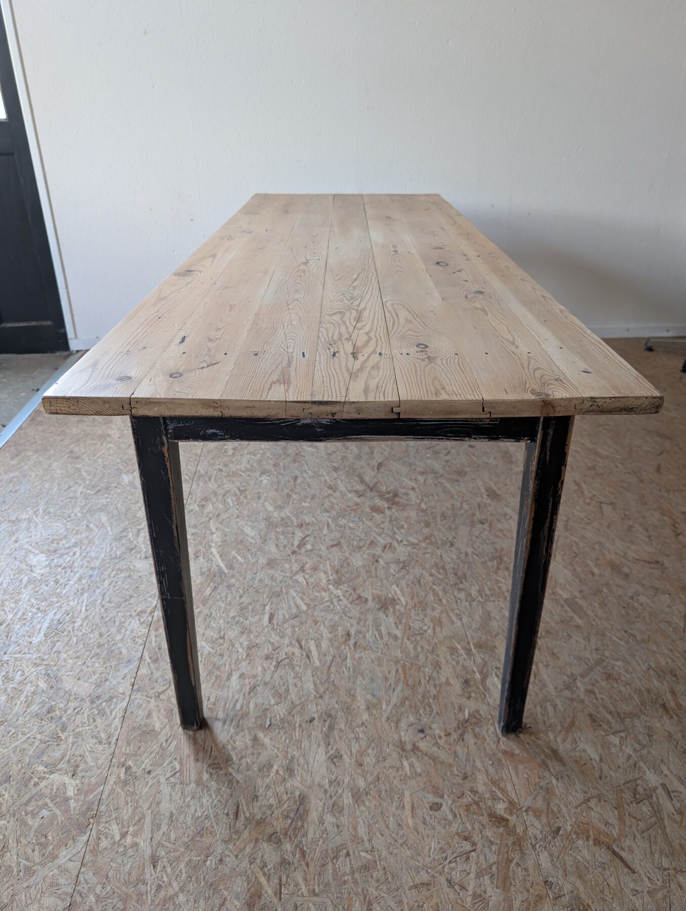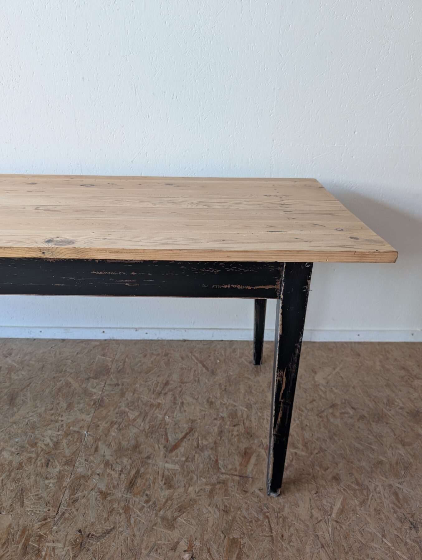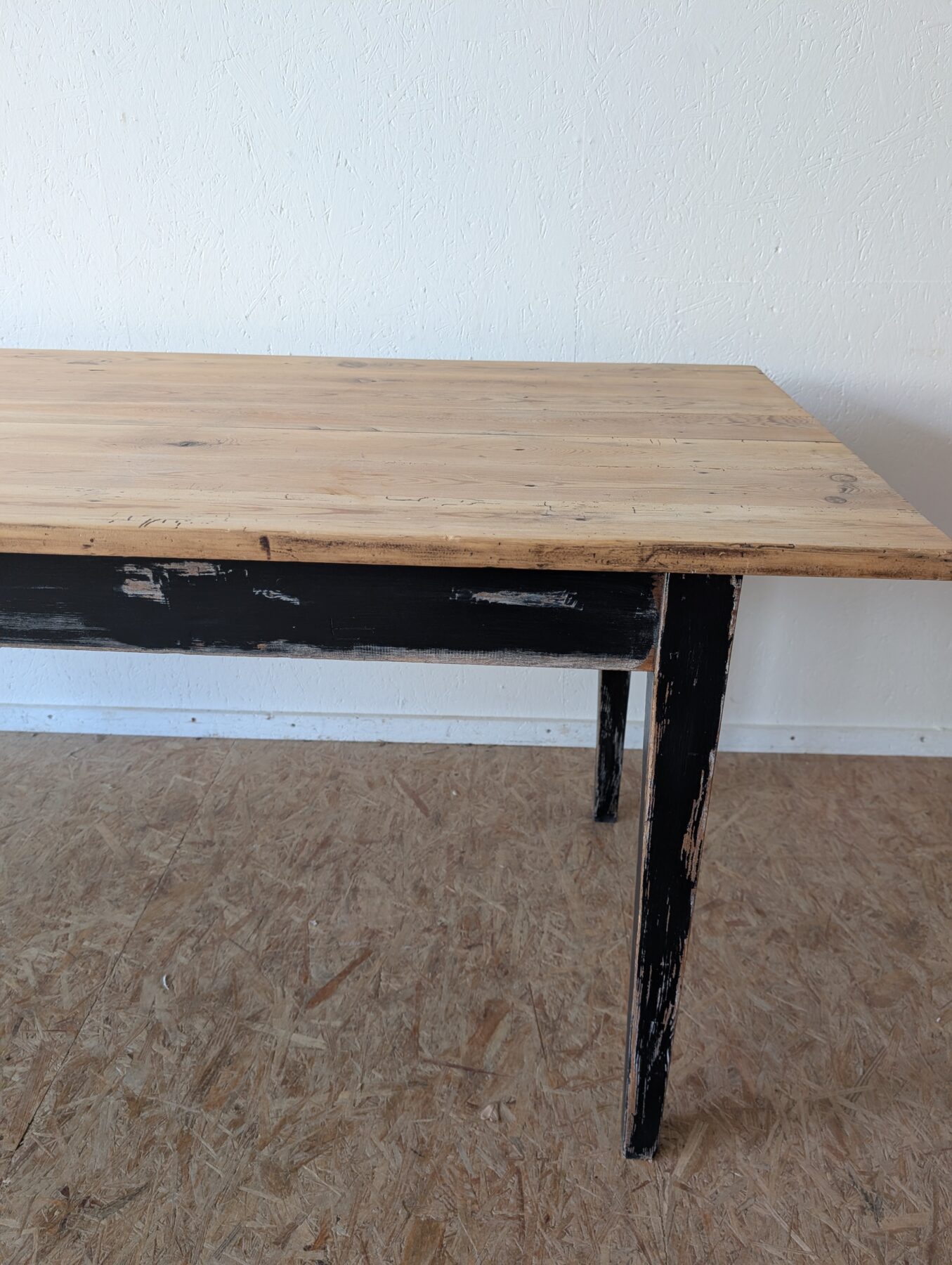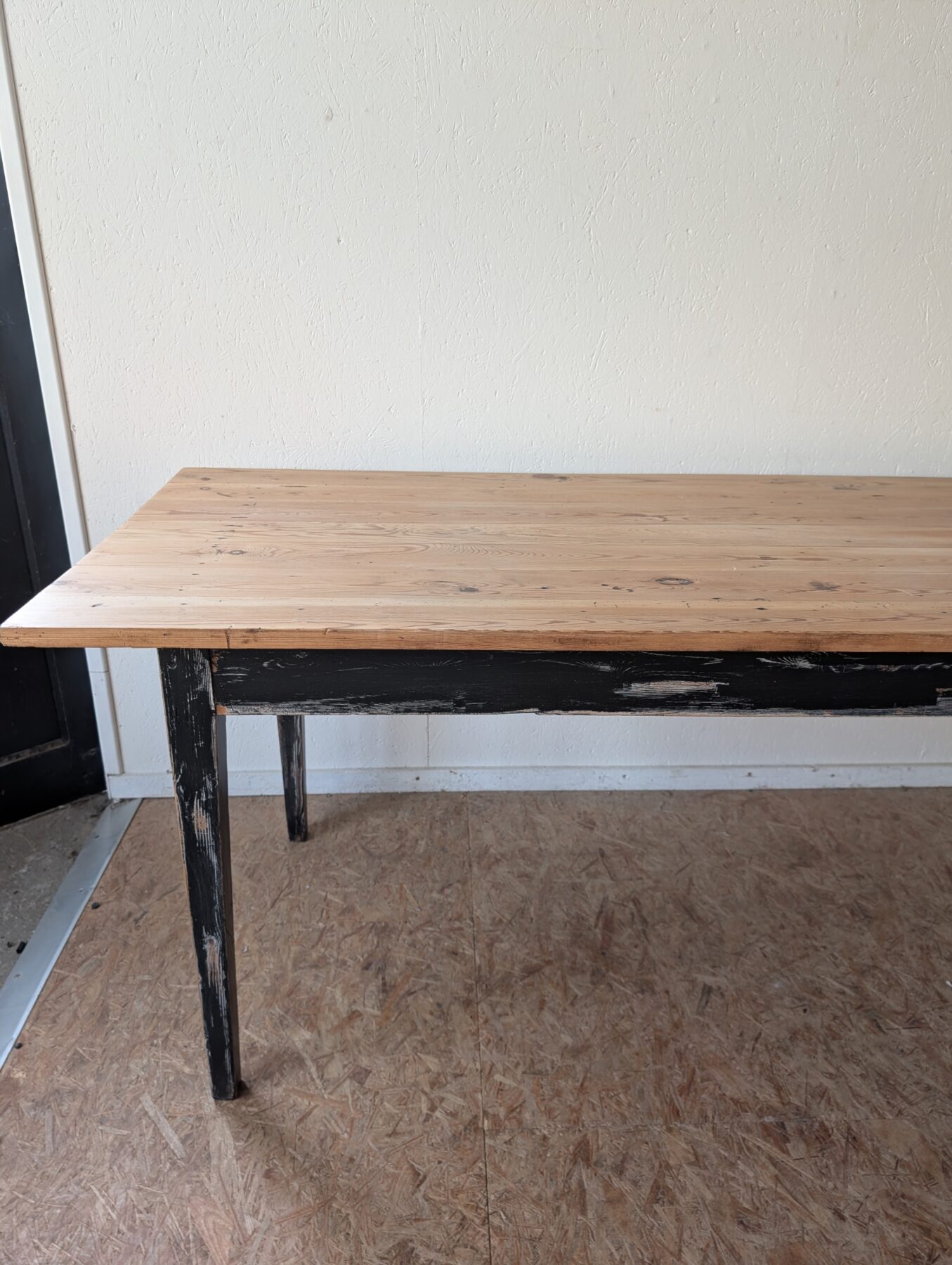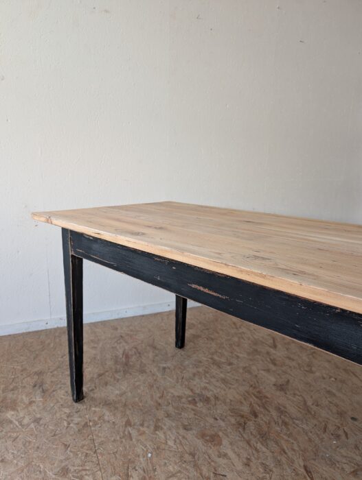 Table de ferme en sapin années 50 avec ceinture et pieds patinés en noir.