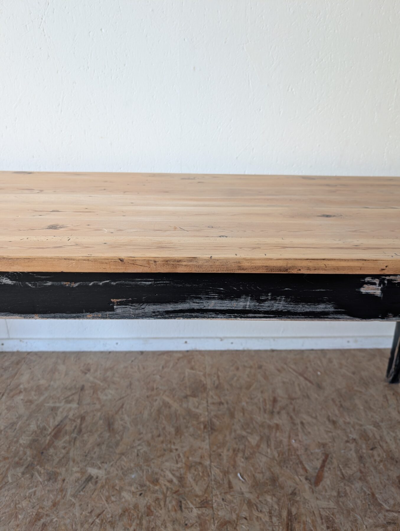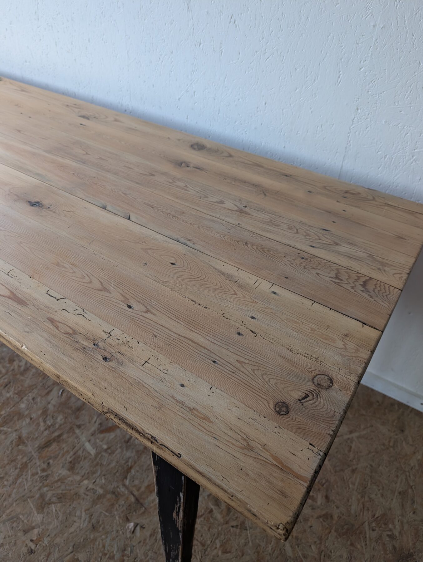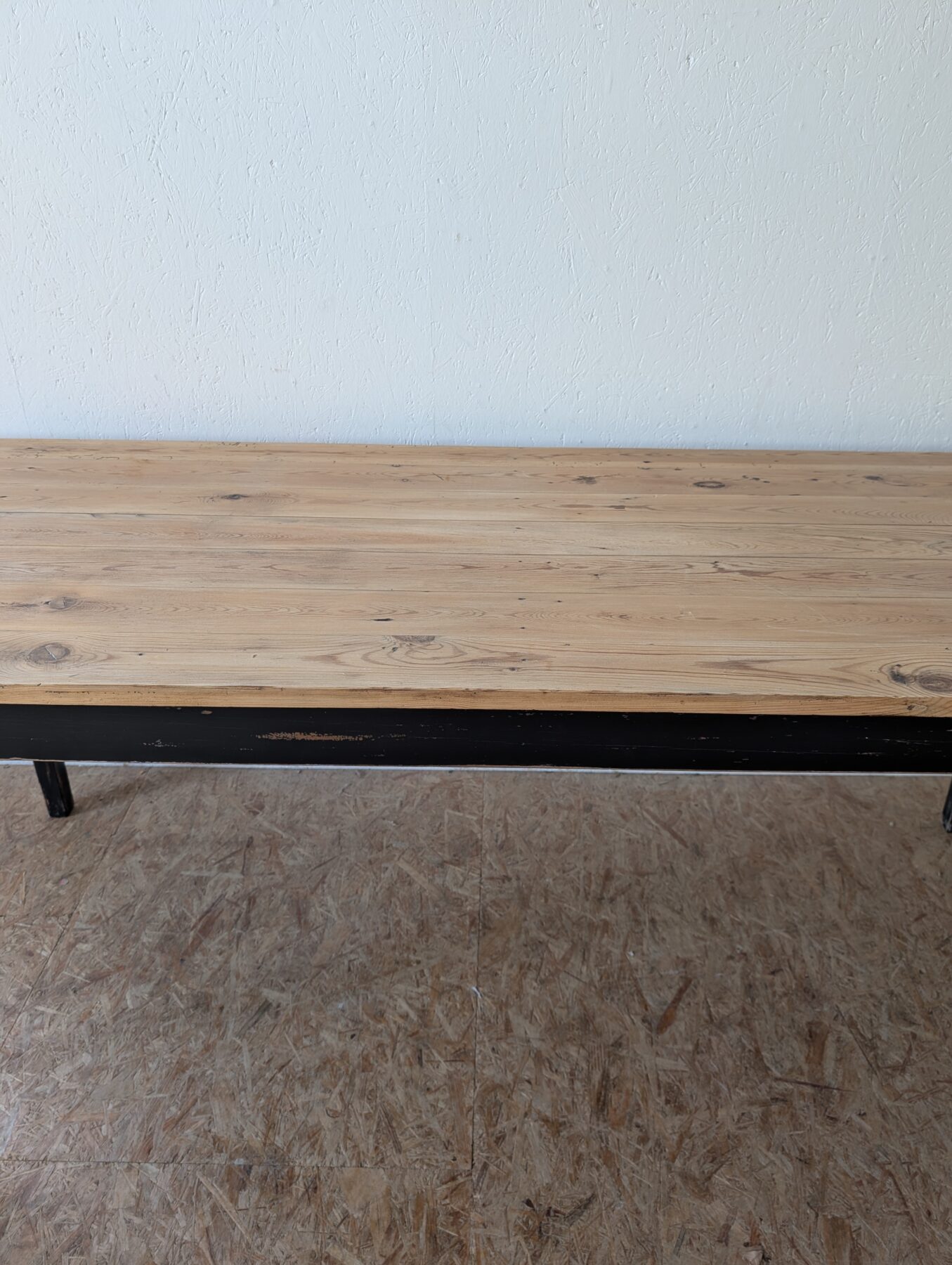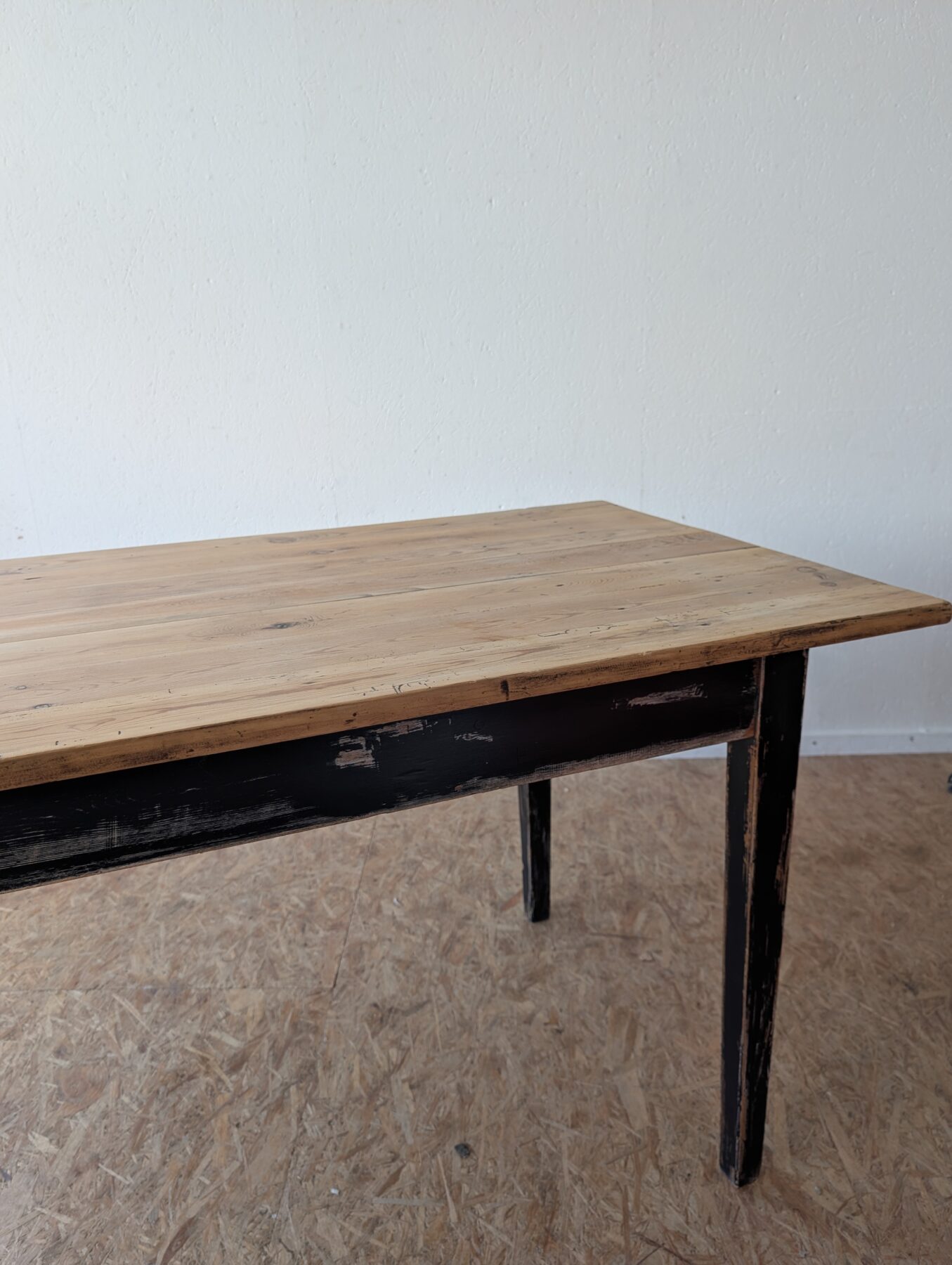 Table de ferme en sapin années 50 avec ceinture et pieds patinés en noir.