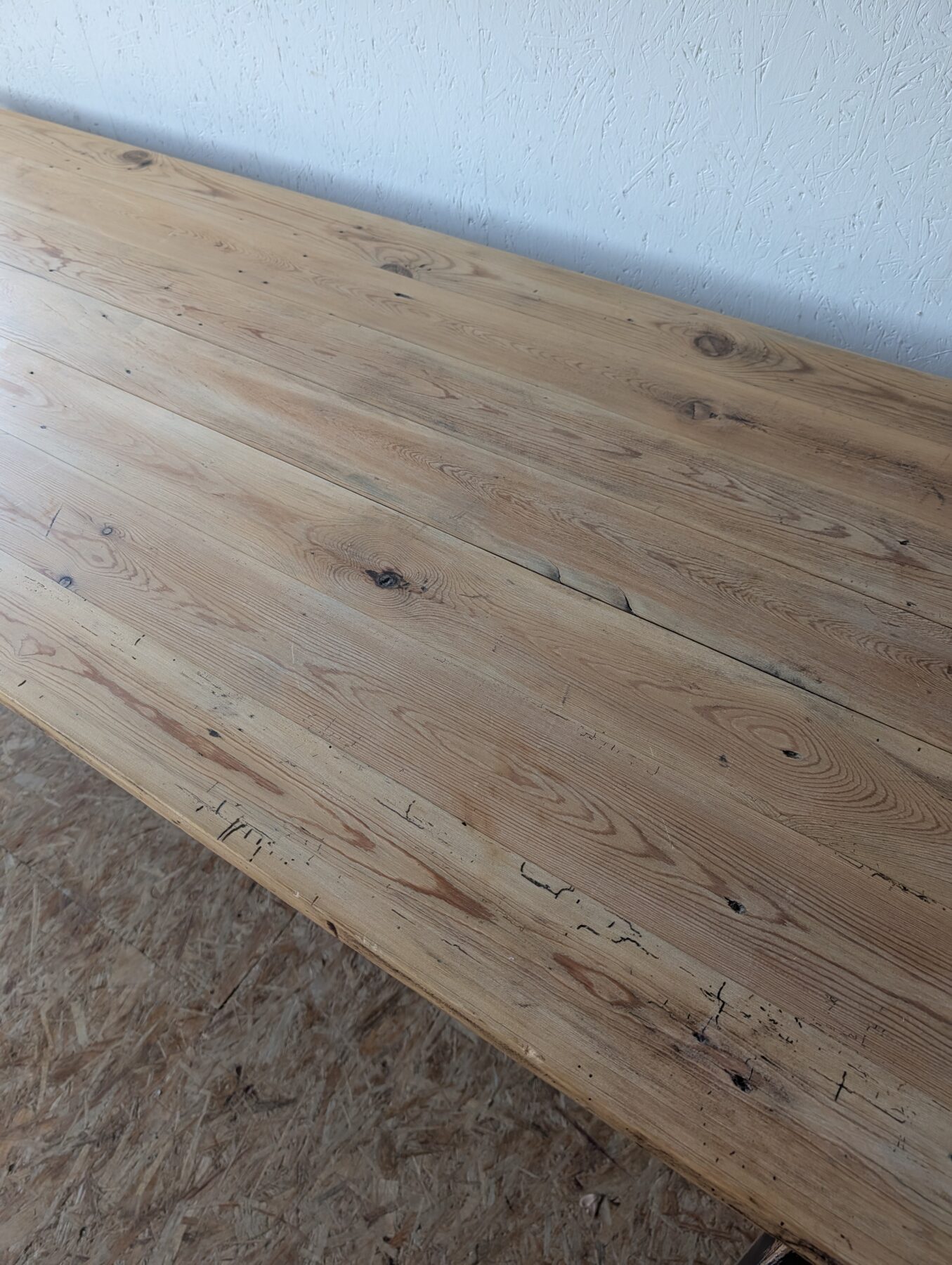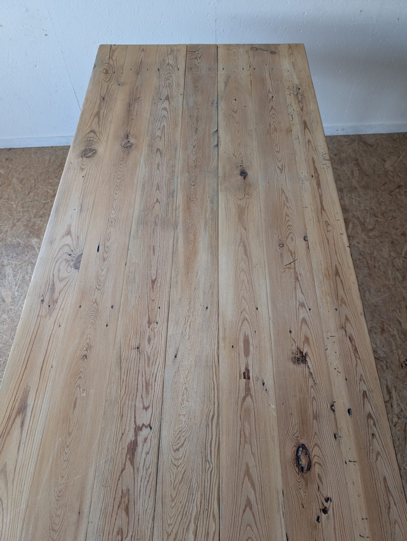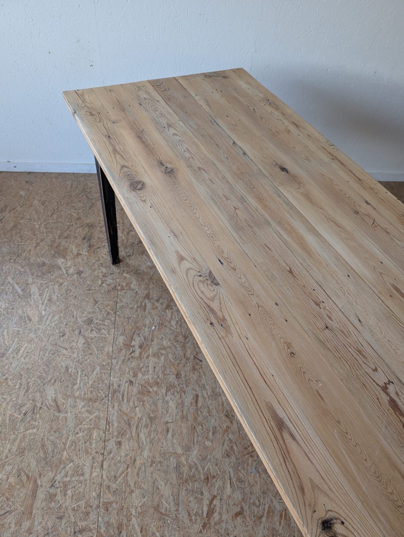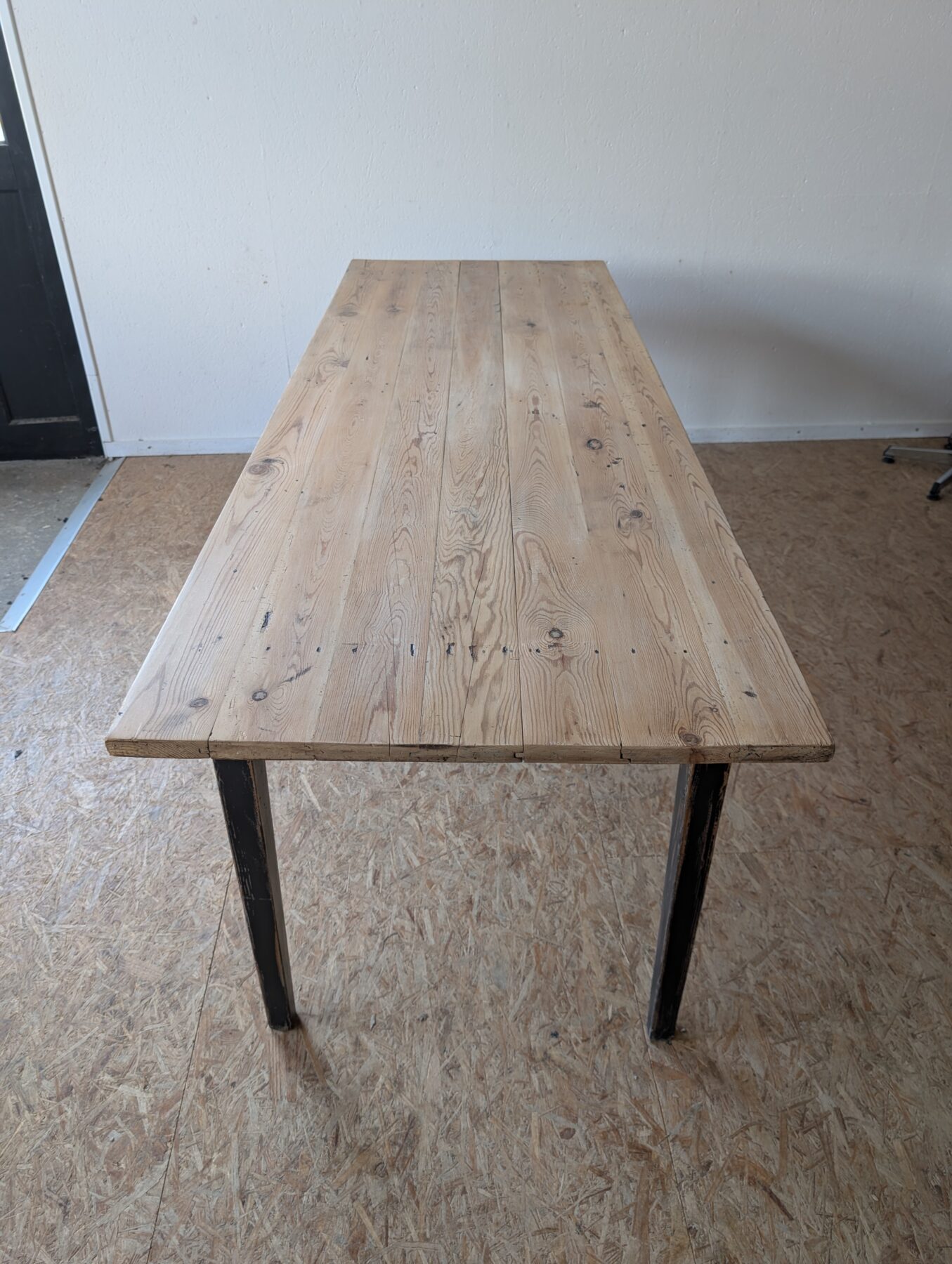 Table de ferme en sapin années 50 avec ceinture et pieds patinés en noir.