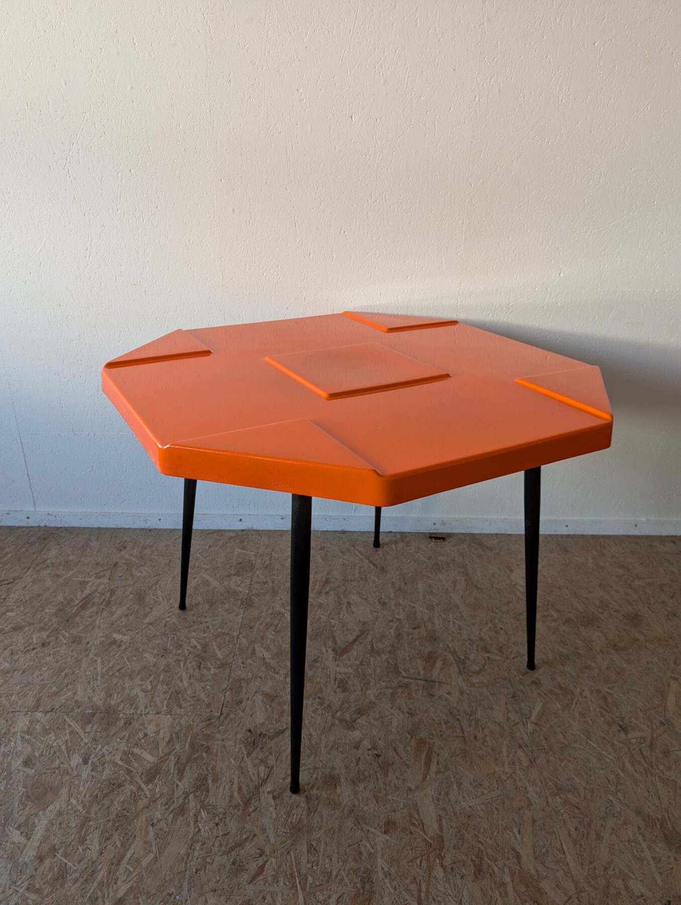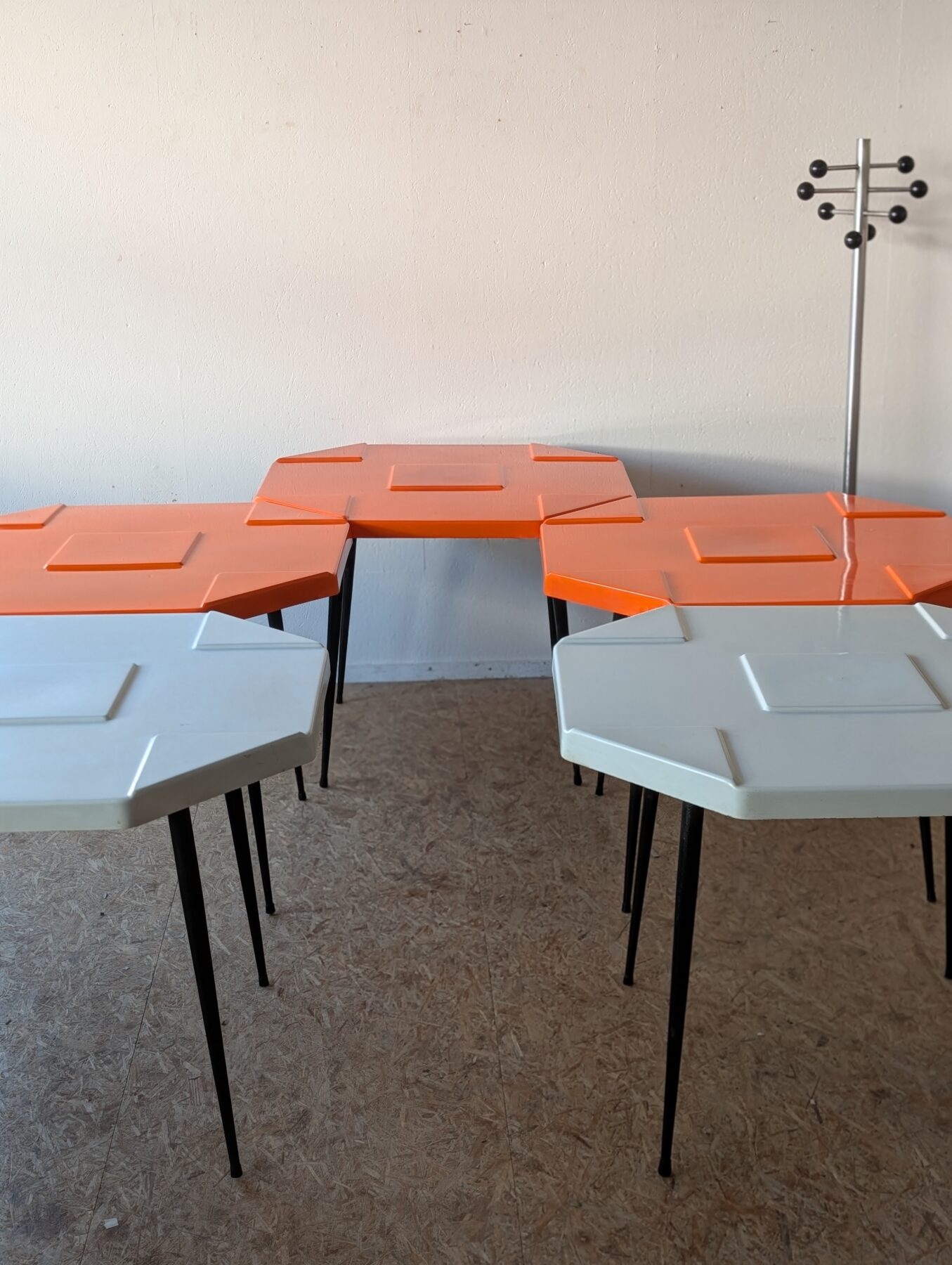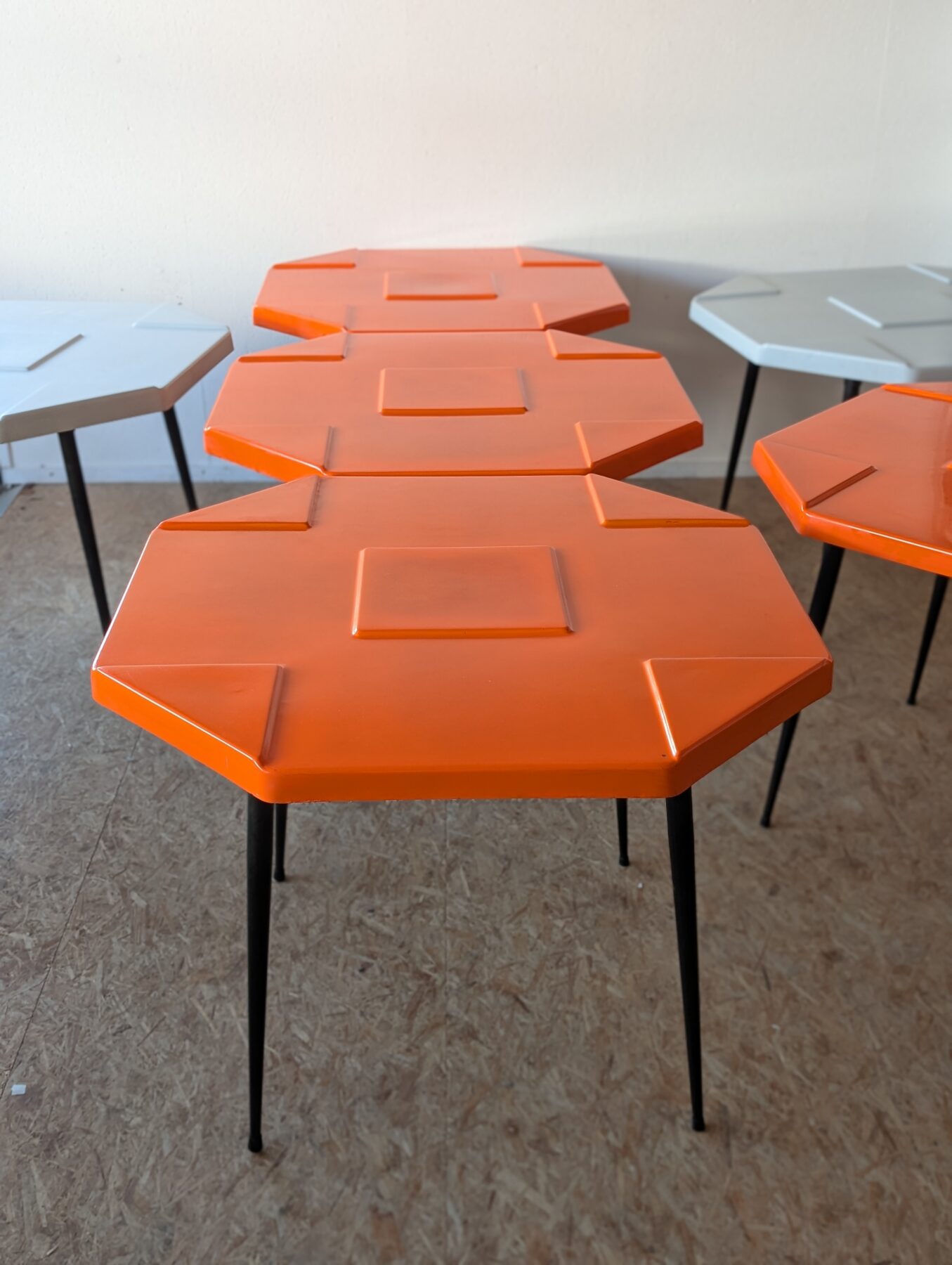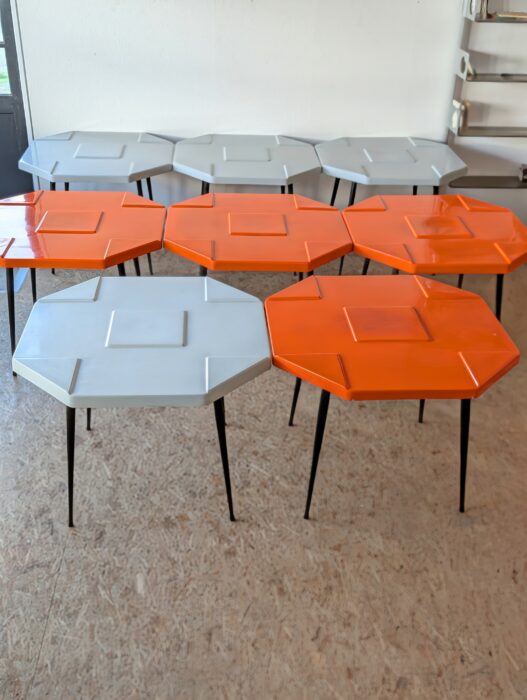 Ensemble de 15 tables (11 orange et 4 grises) en fibre de verre et pieds métalliques noirs des années 70, design space age.