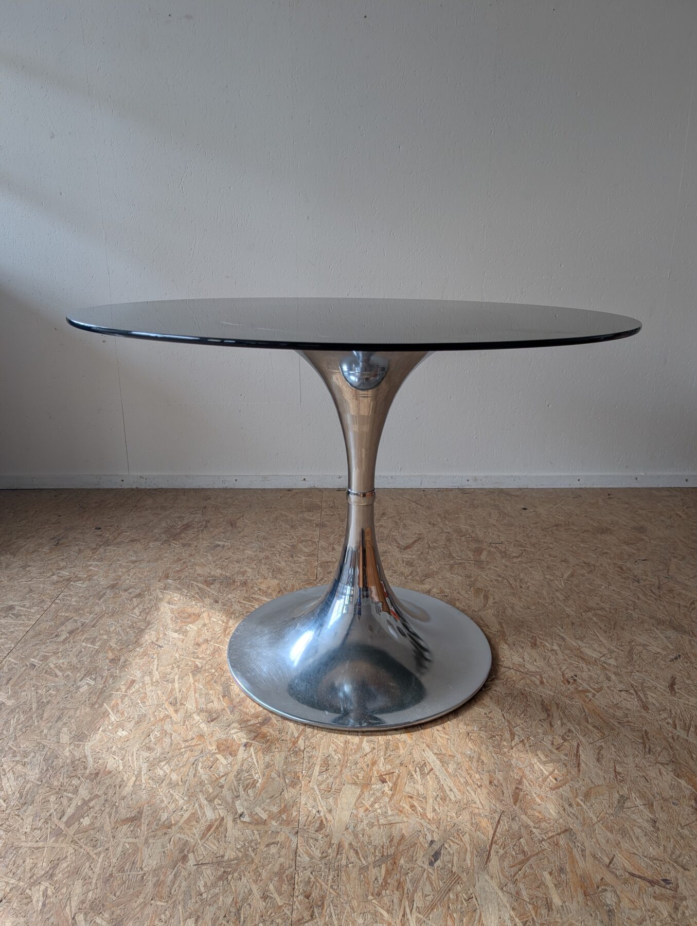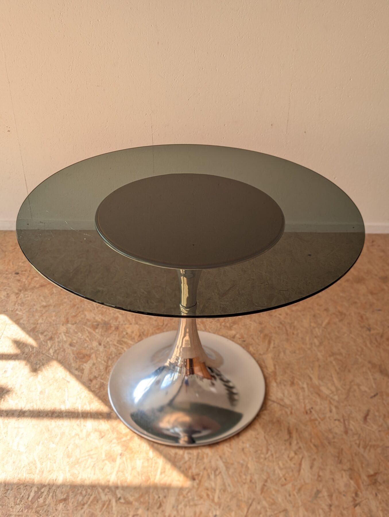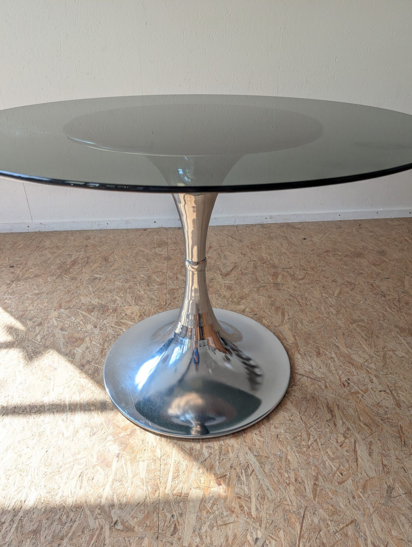 Table ronde Roche Bobois des années 70 avec plateau verre fumé et piétement tulipe en métal chromé.