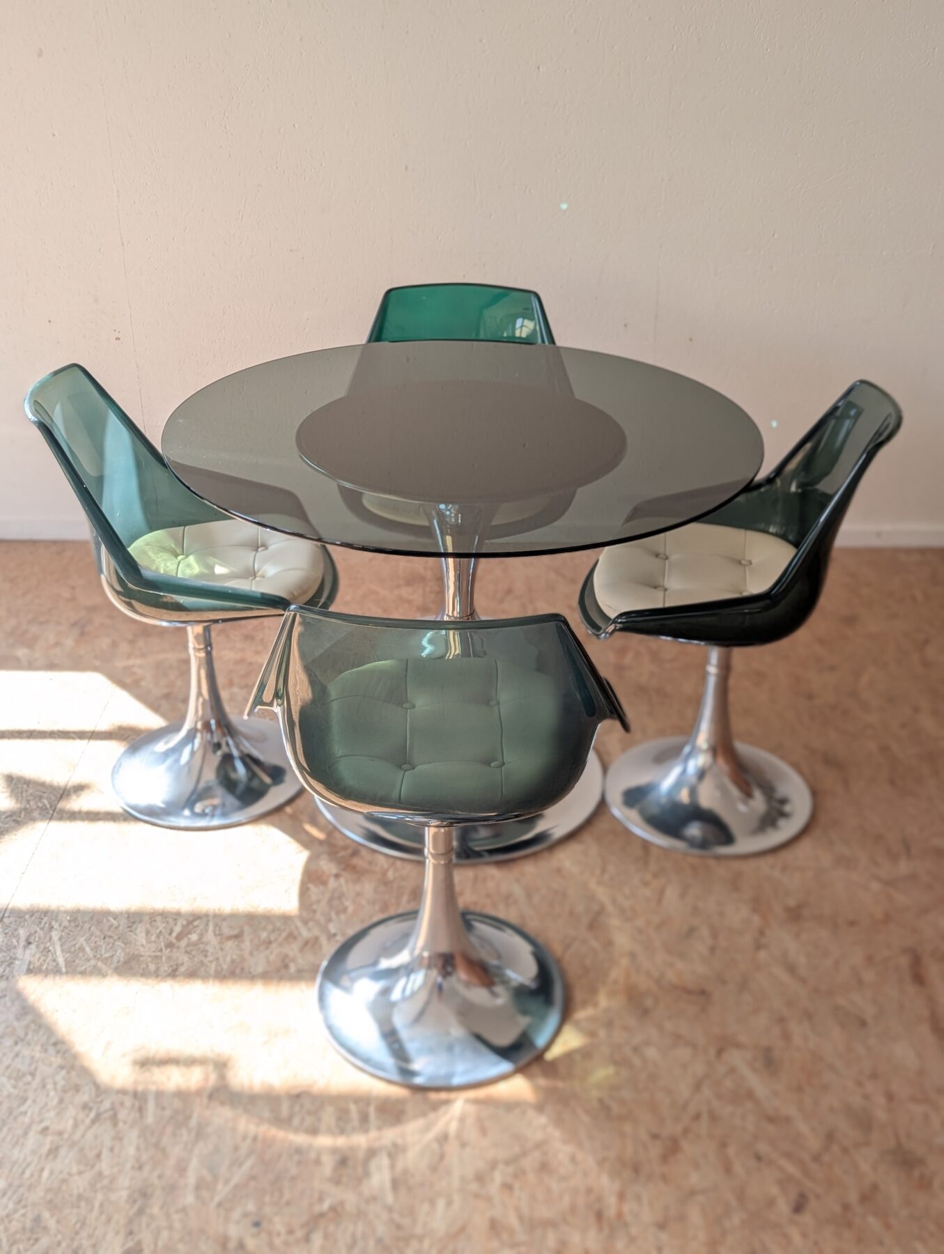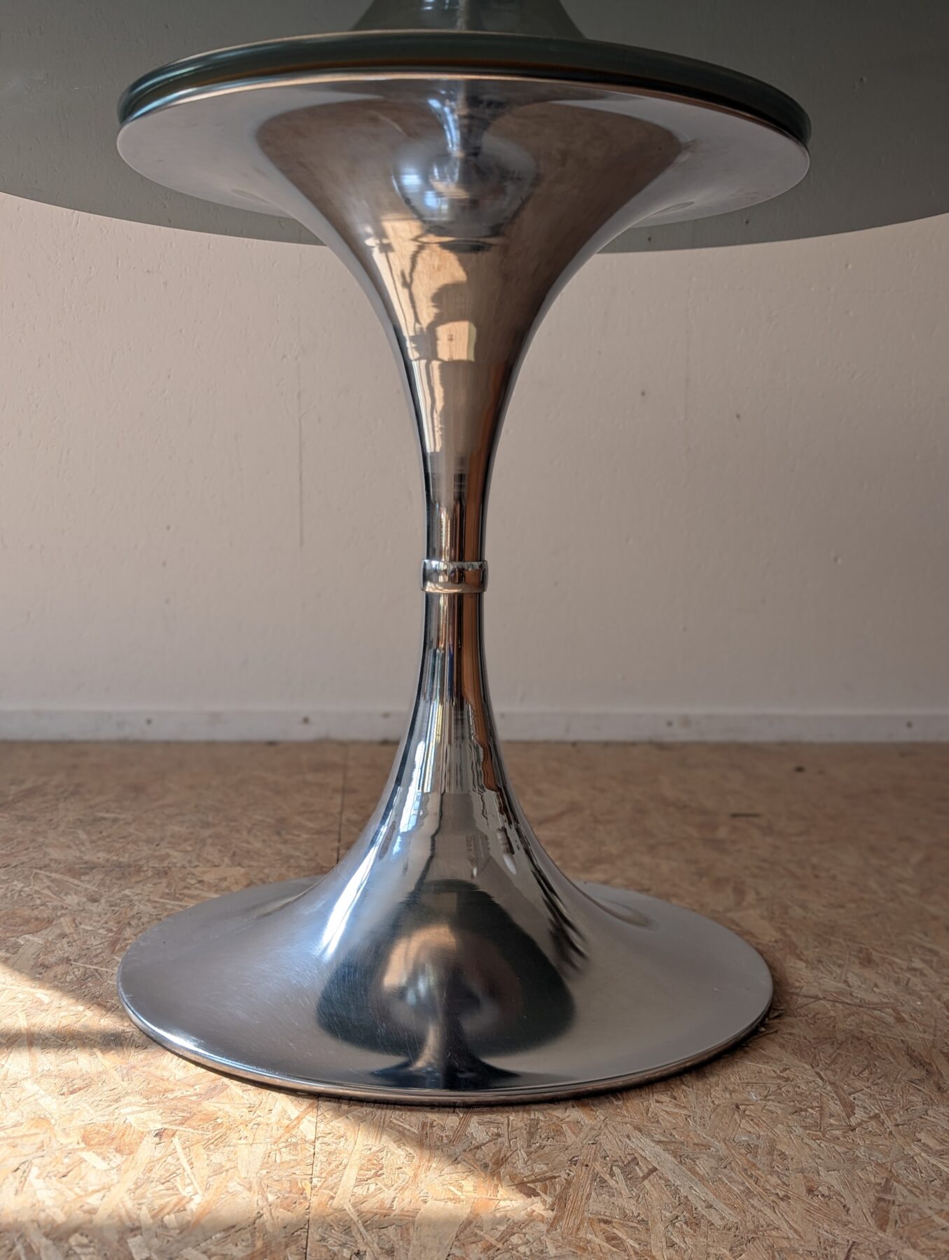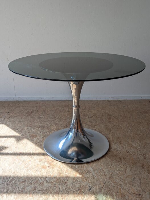 Table ronde Roche Bobois des années 70 avec plateau verre fumé et piétement tulipe en métal chromé.