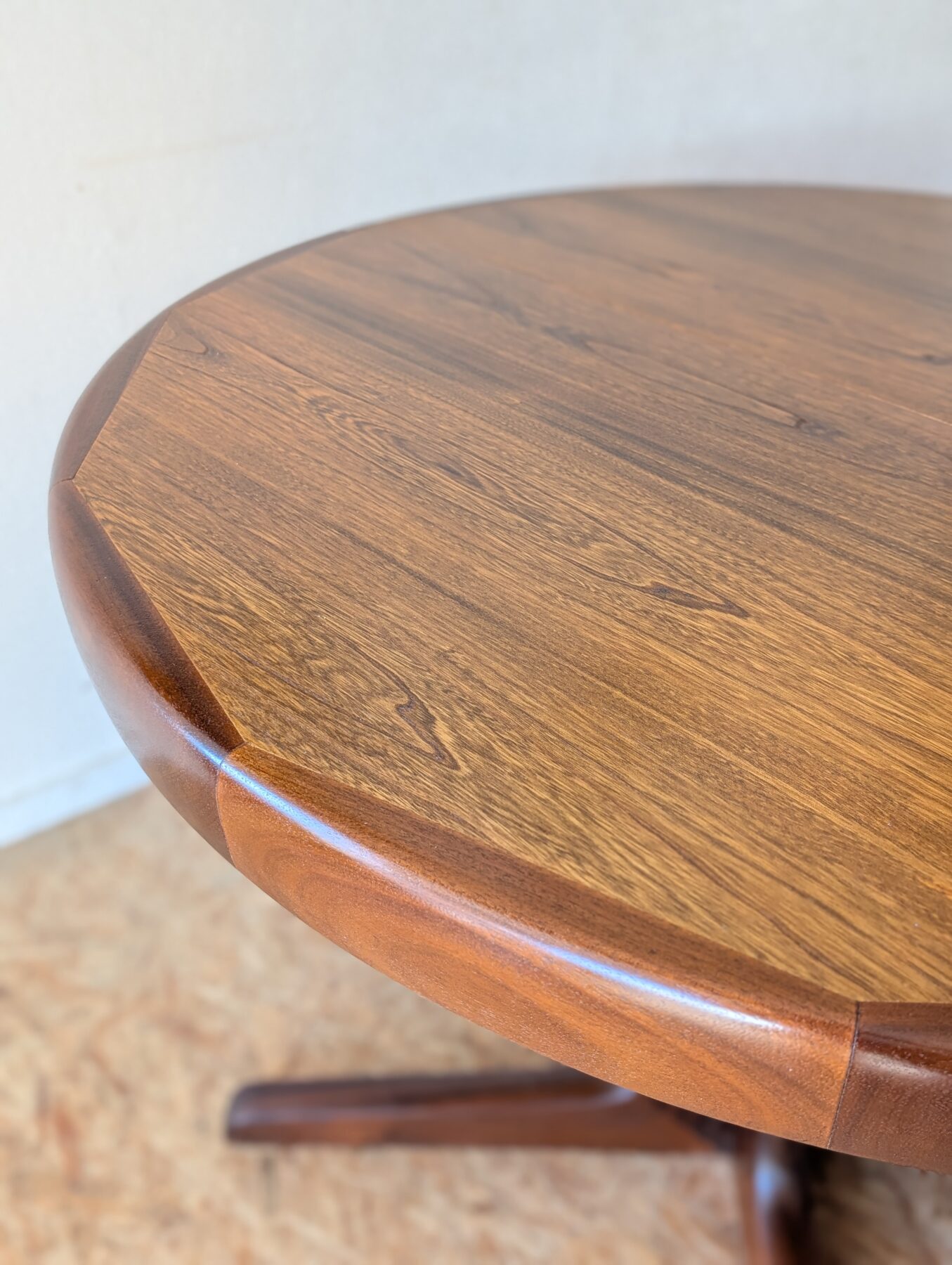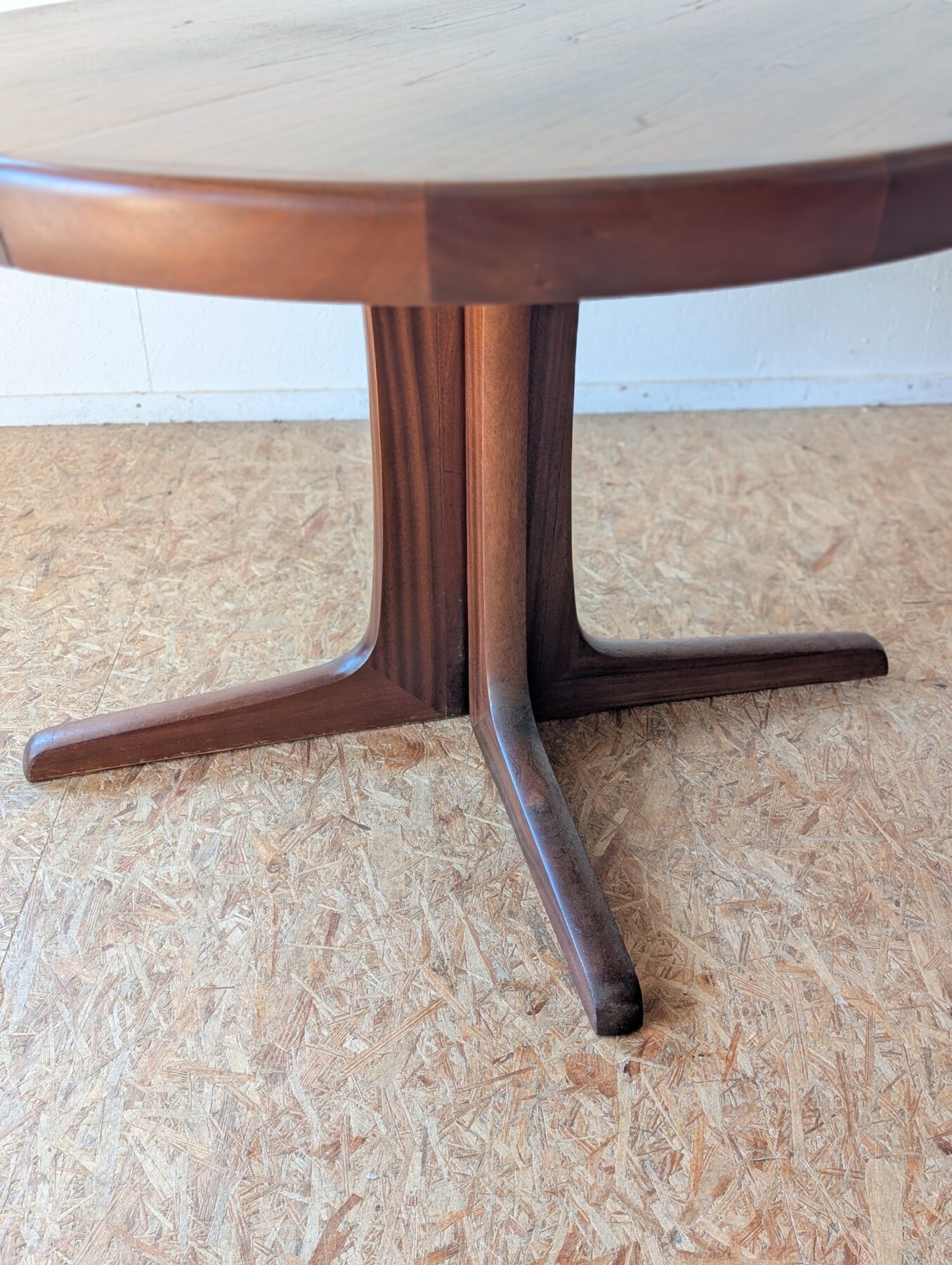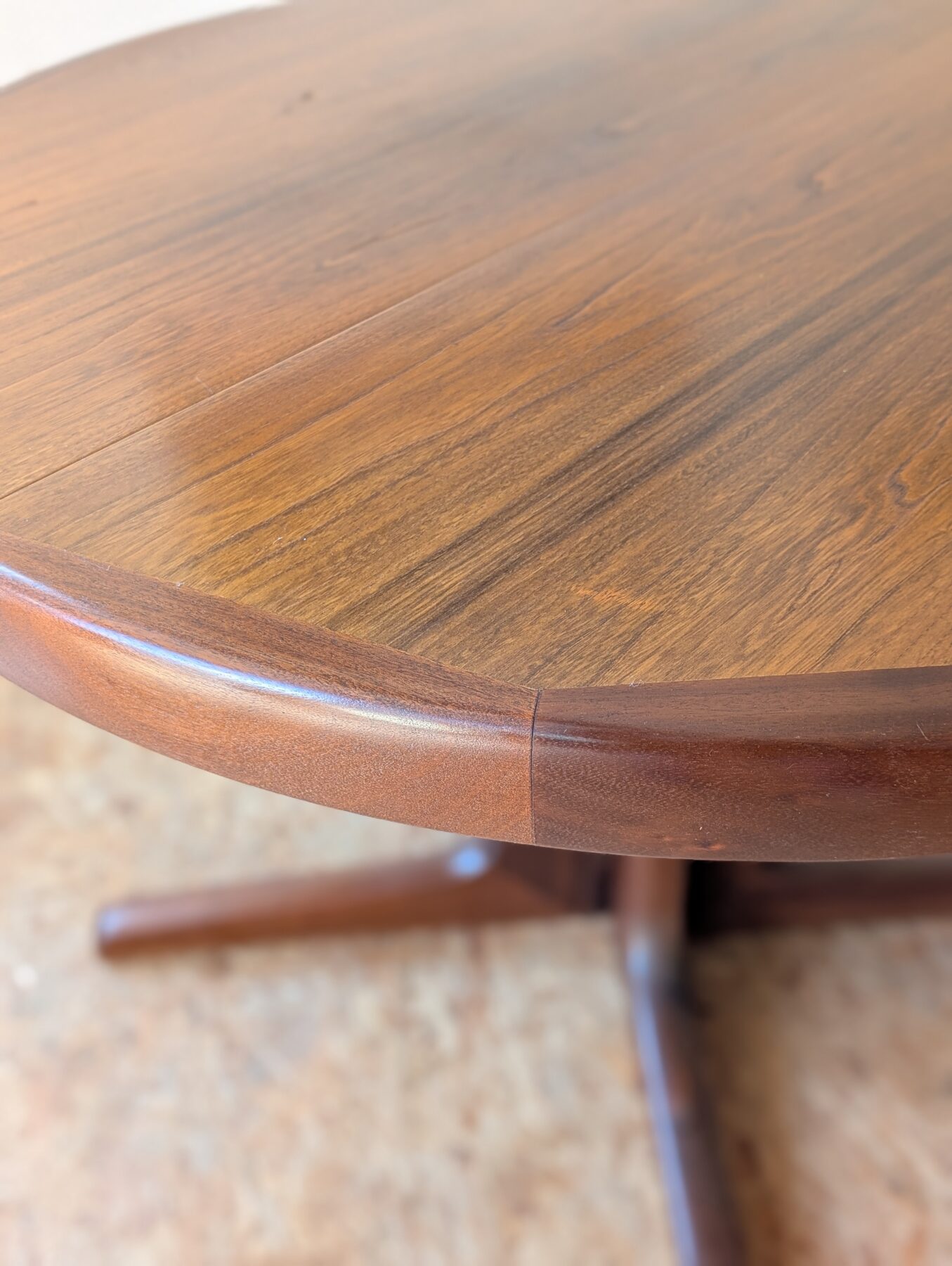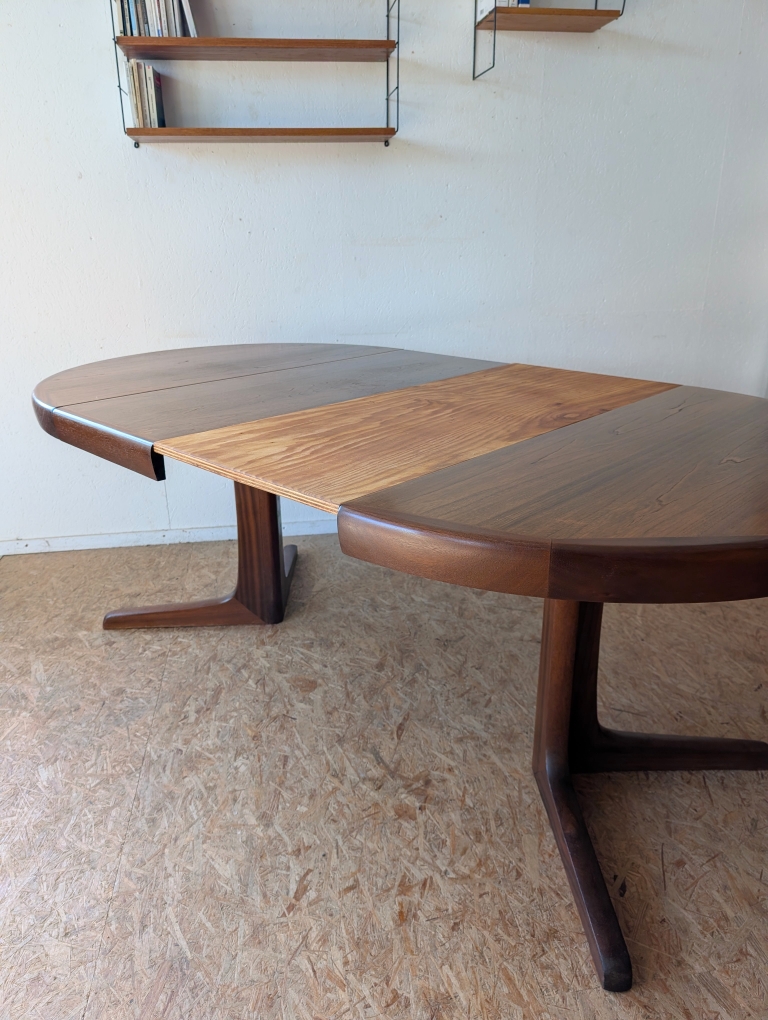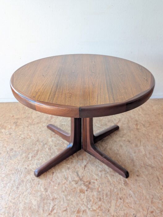 Table ronde en teck avec pied étoile de très belle facture, 3 grandeurs possibles : diamètre 110 cm, extensible à 150 cm avec une rallonge d’origine (avec même veinage et chant massif) et à 199 cm avec une autre rallonge (pas d’origine). Les rallonges sont indépendantes.