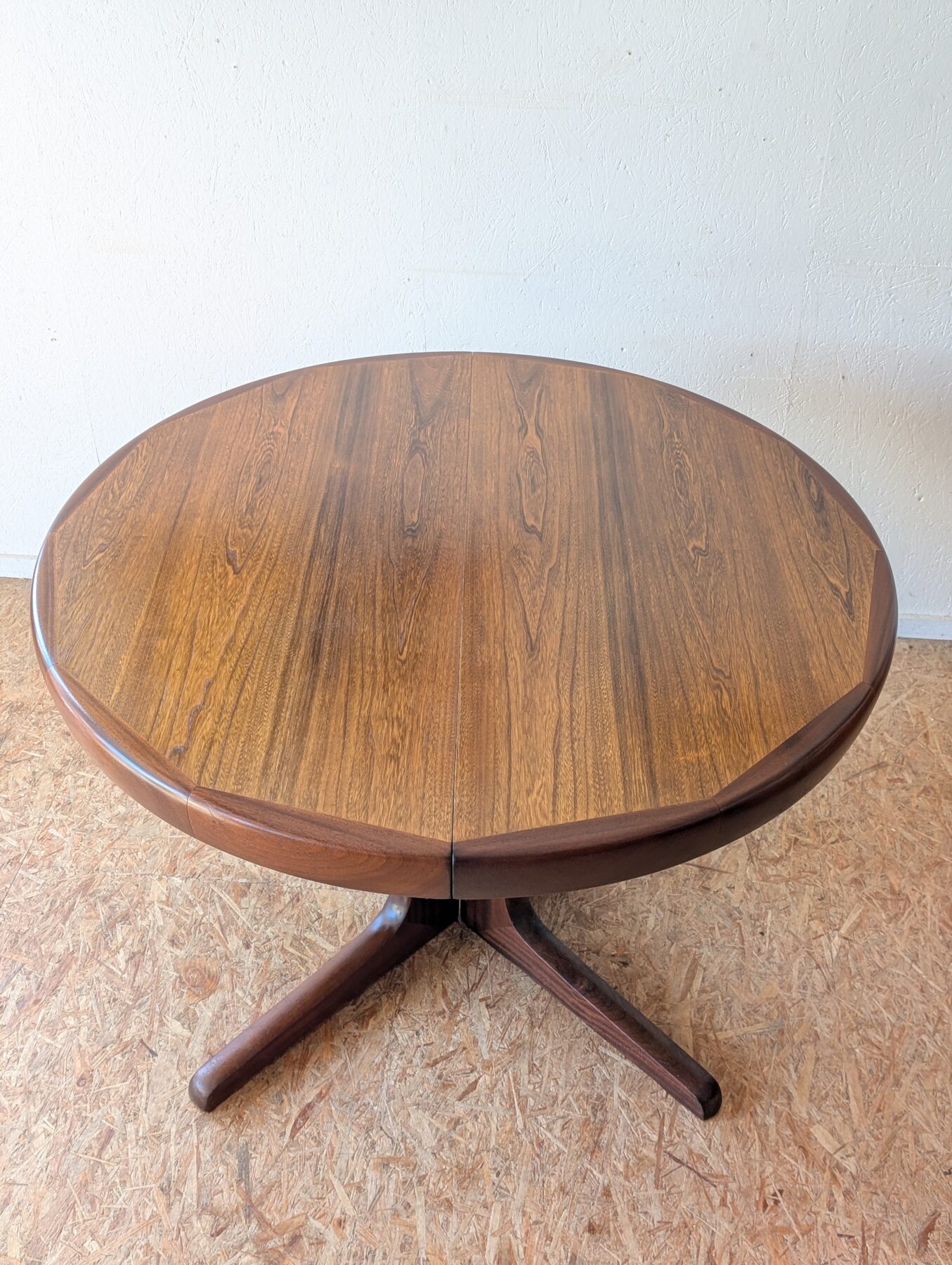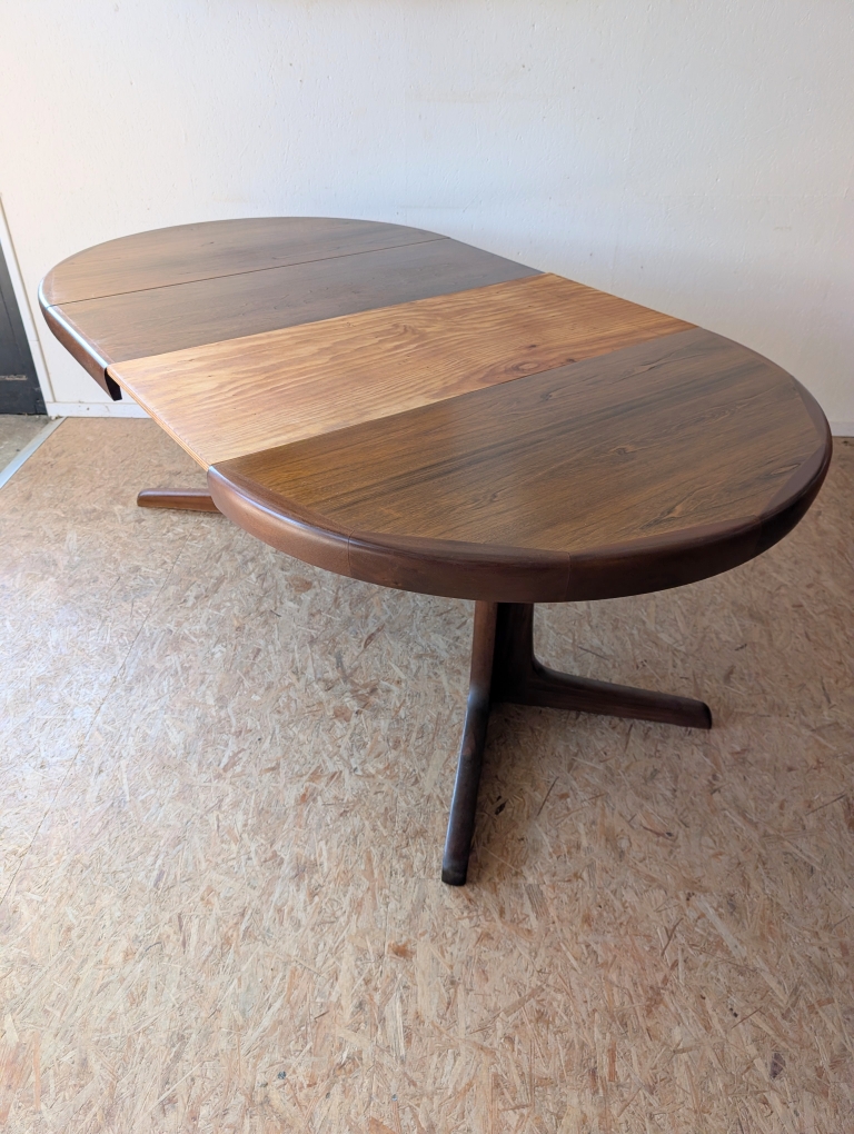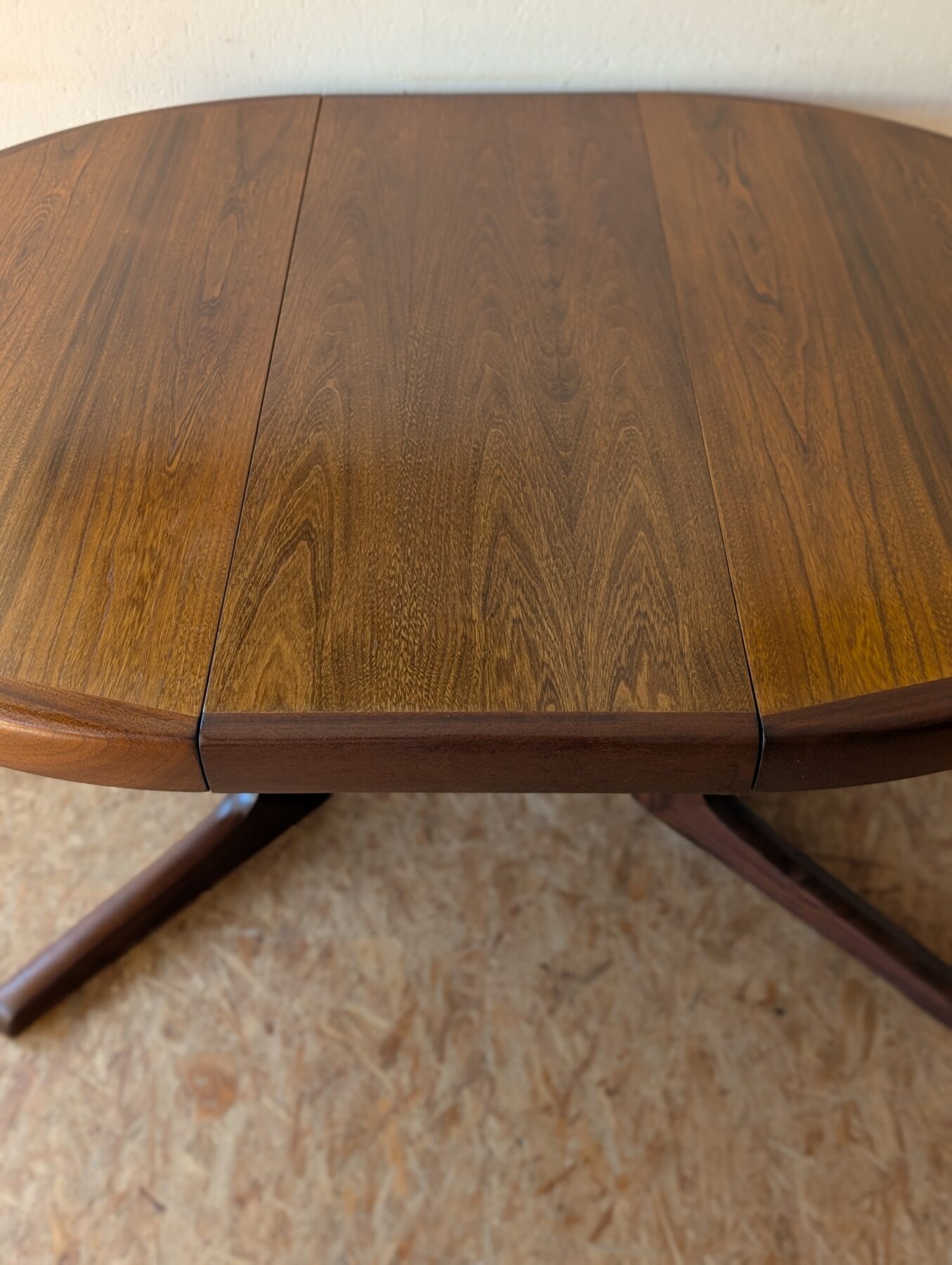 Table ronde en teck avec pied étoile de très belle facture, 3 grandeurs possibles : diamètre 110 cm, extensible à 150 cm avec une rallonge d’origine (avec même veinage et chant massif) et à 199 cm avec une autre rallonge (pas d’origine). Les rallonges sont indépendantes.