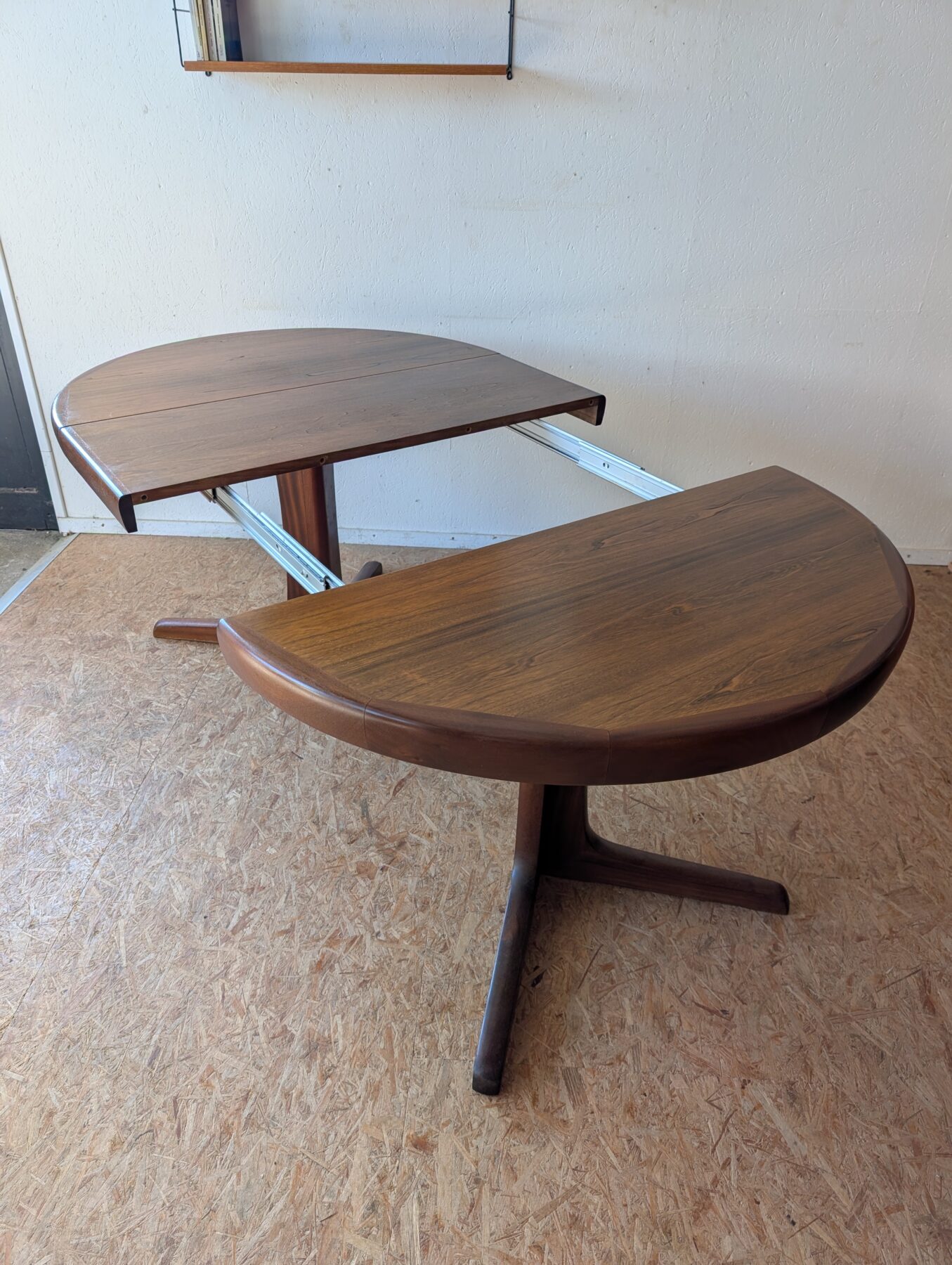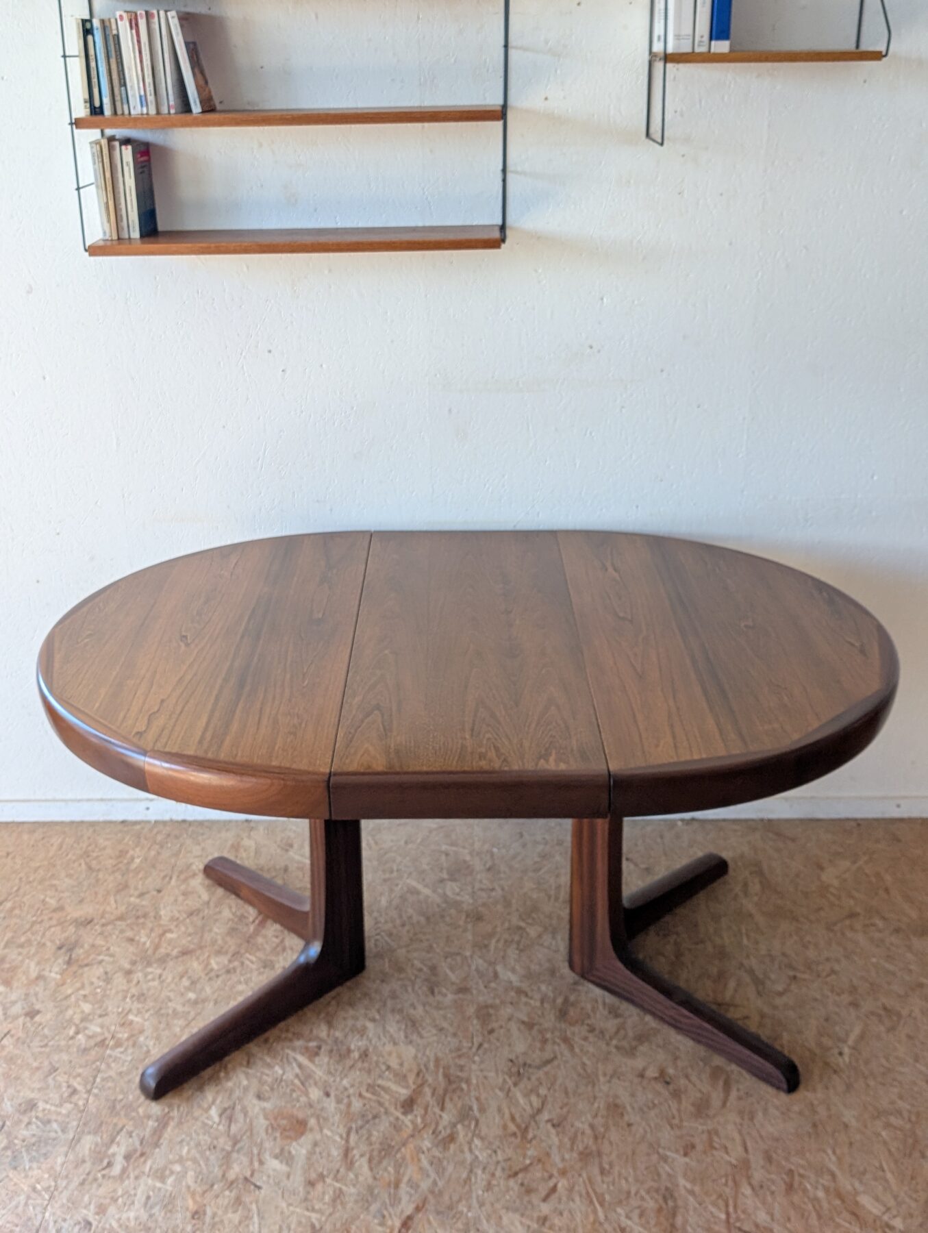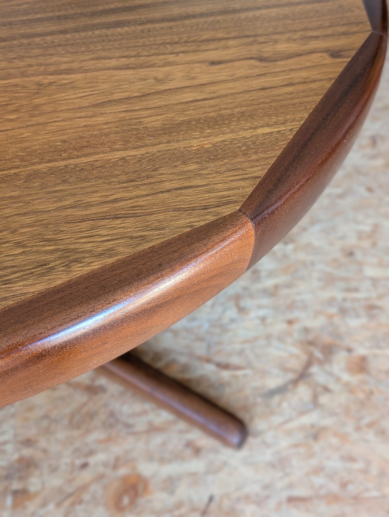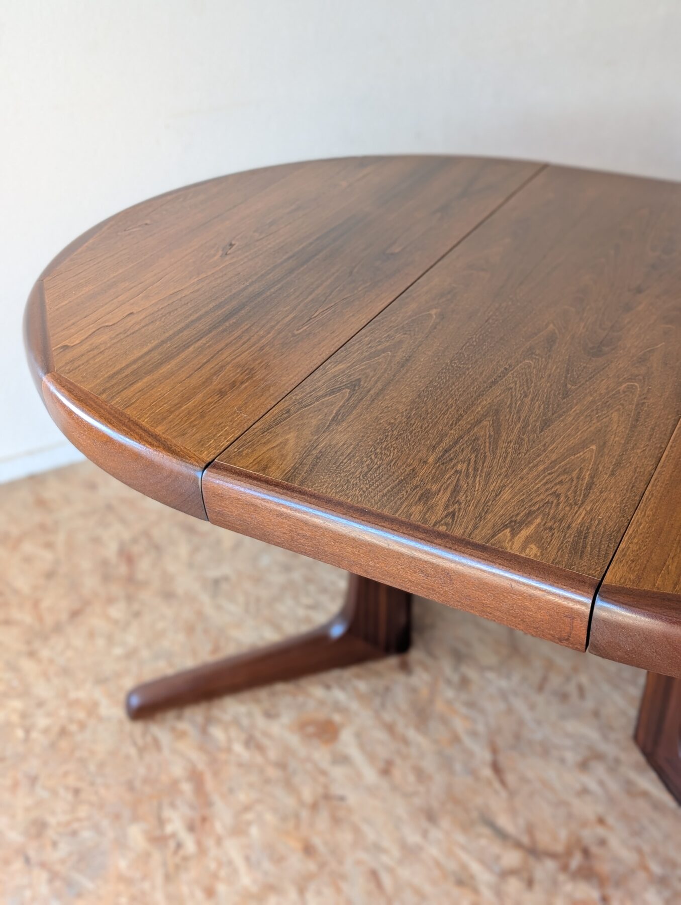 Table ronde en teck avec pied étoile de très belle facture, 3 grandeurs possibles : diamètre 110 cm, extensible à 150 cm avec une rallonge d’origine (avec même veinage et chant massif) et à 199 cm avec une autre rallonge (pas d’origine). Les rallonges sont indépendantes.