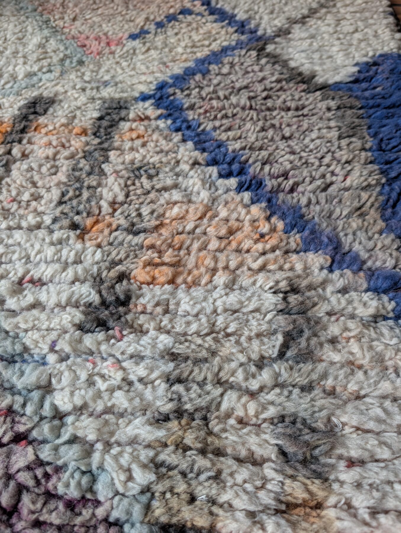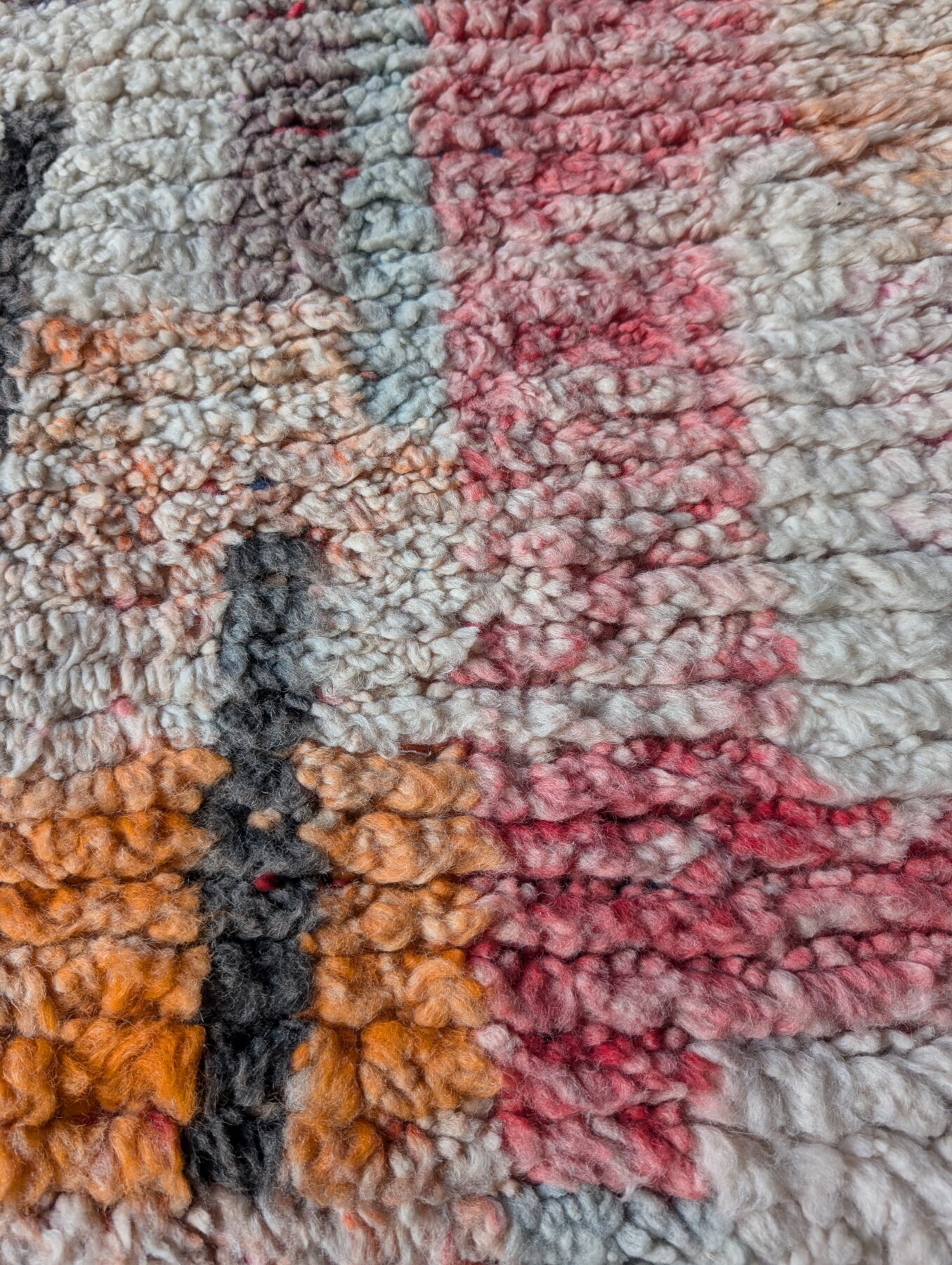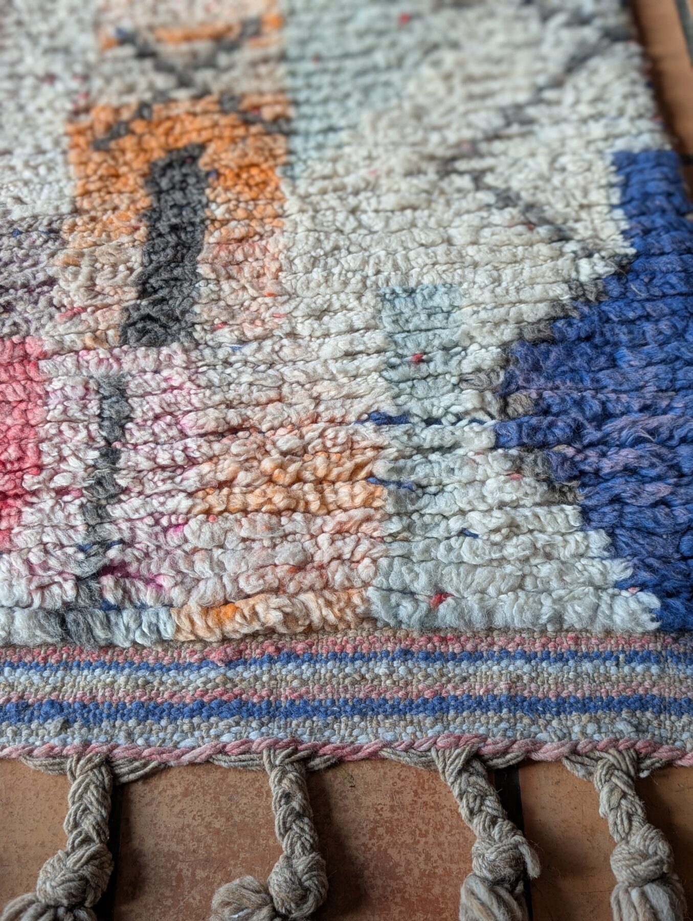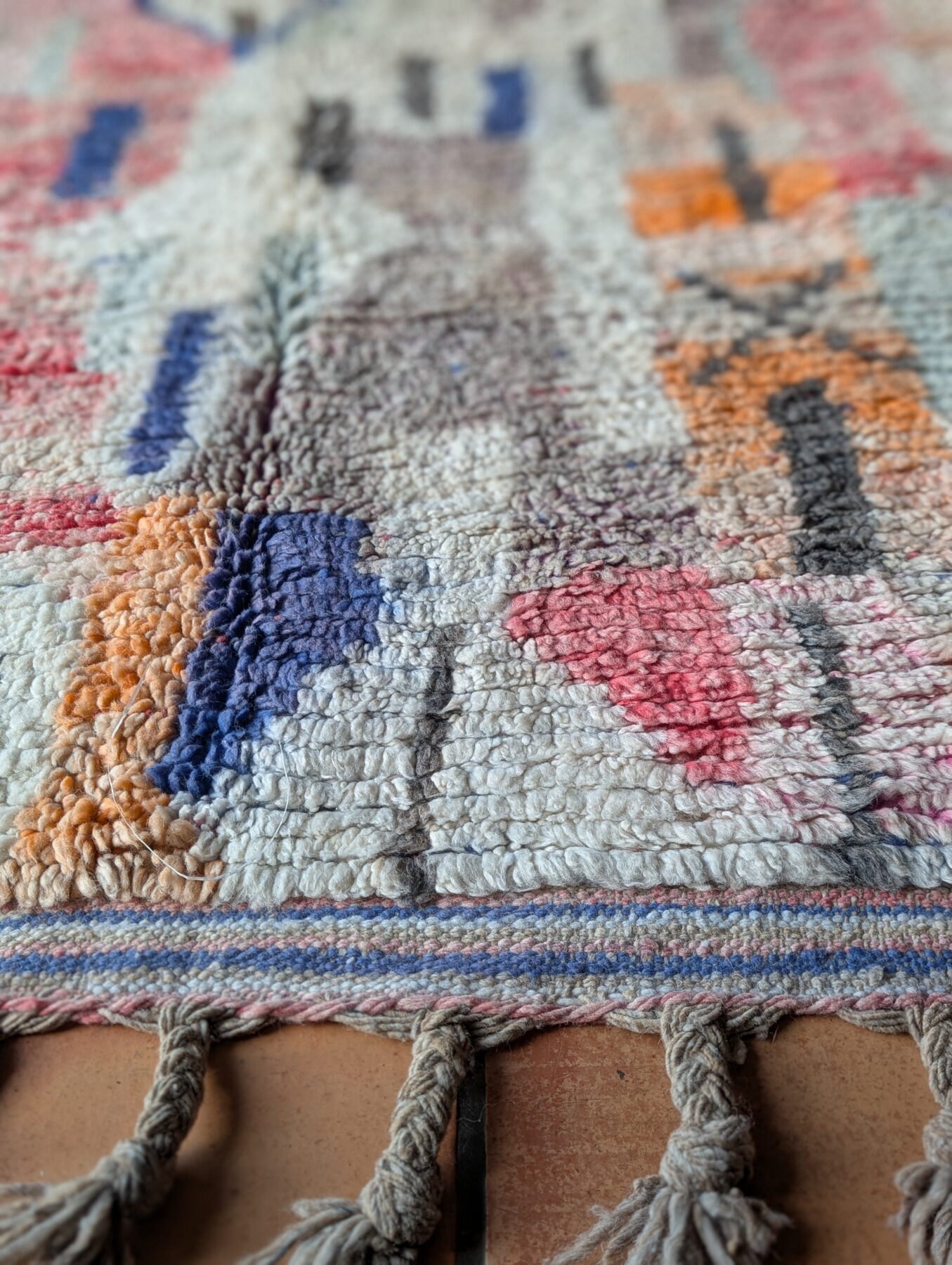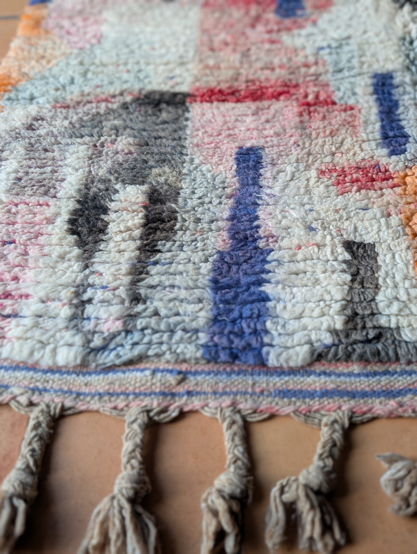 Tapis berbère Boujad à motifs colorés, laine de mouton. Fabriqué à la main , fil à fil, sur des métiers à tisser dans le moyen Atlas.