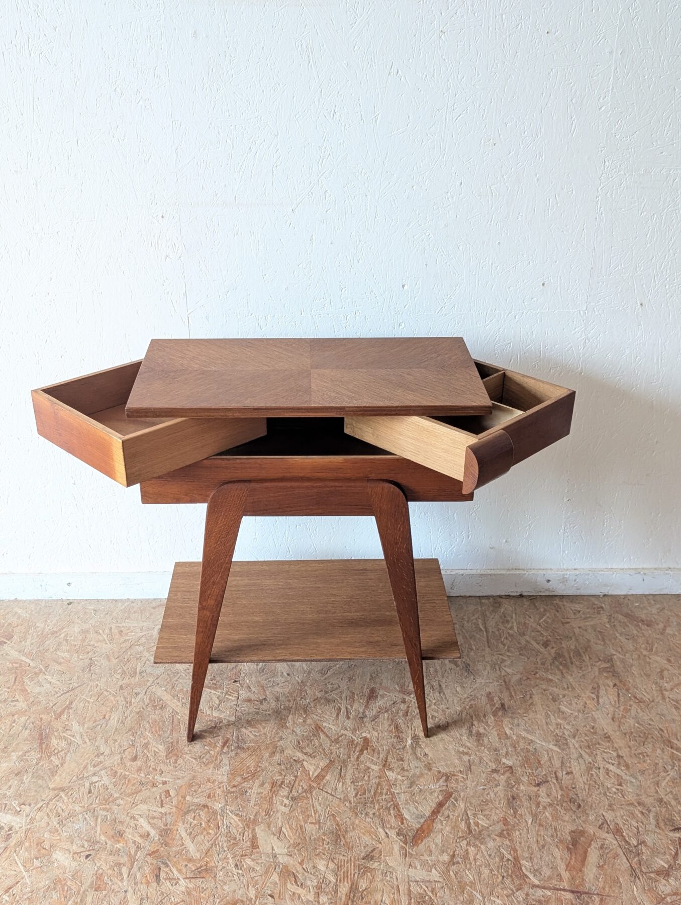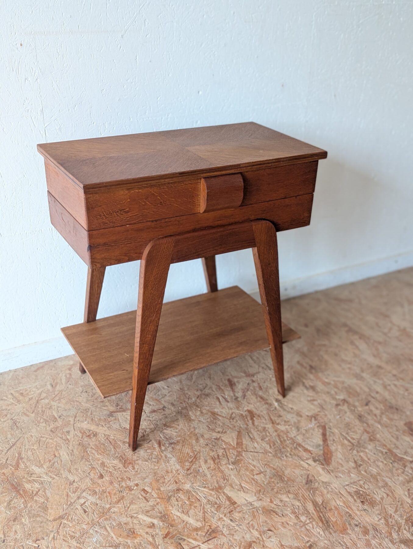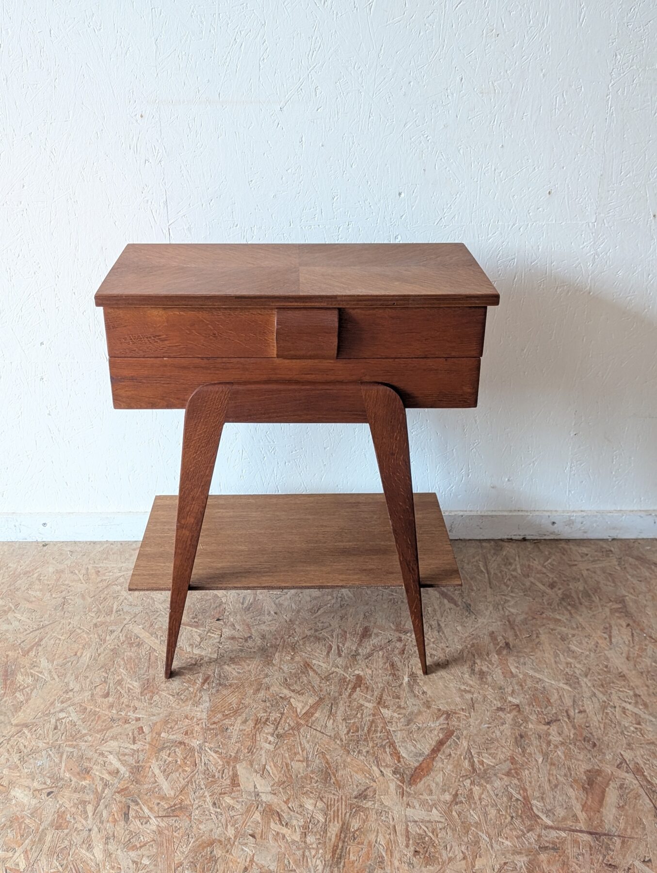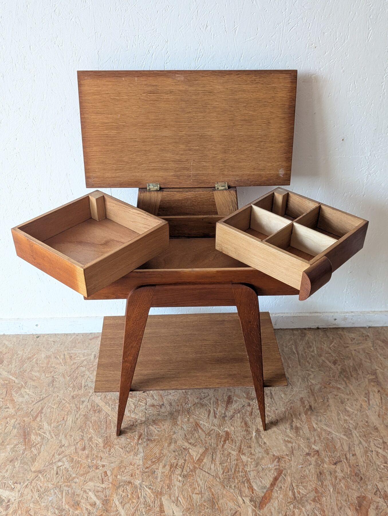 Travailleuse en chêne pieds compas vintage avec plateau ouvrant et casiers déployables. Idéale aussi en table d’appoint ou chevet.