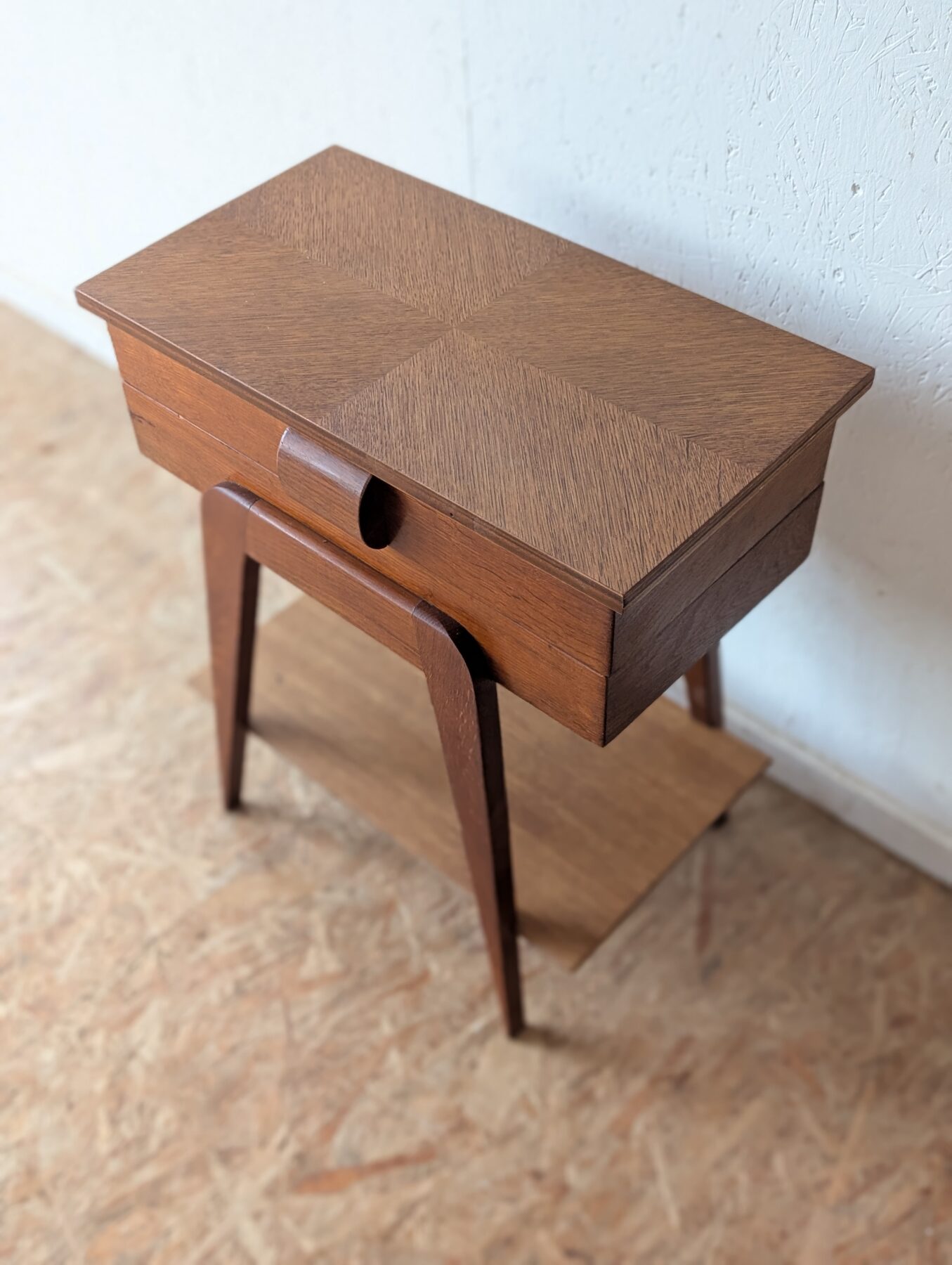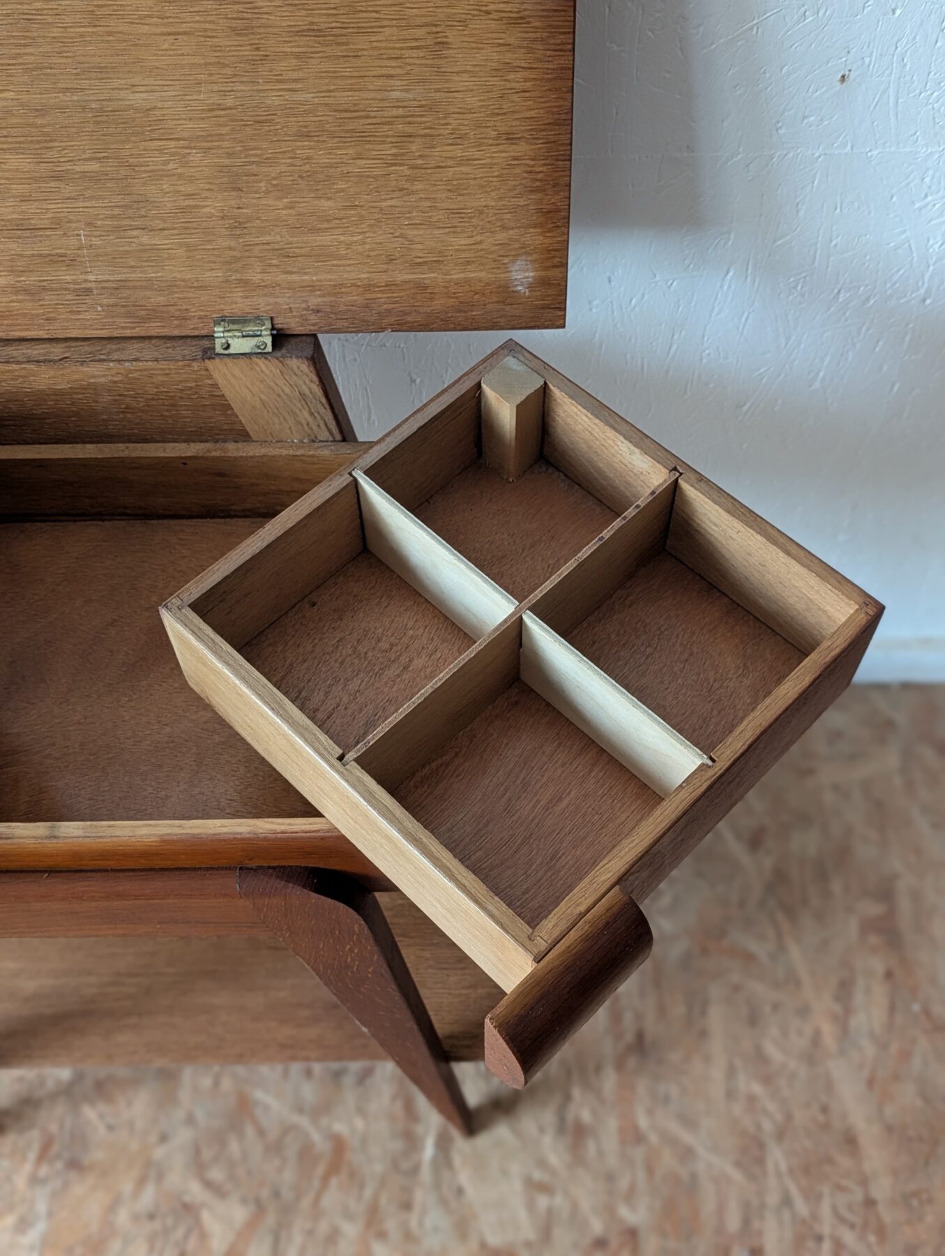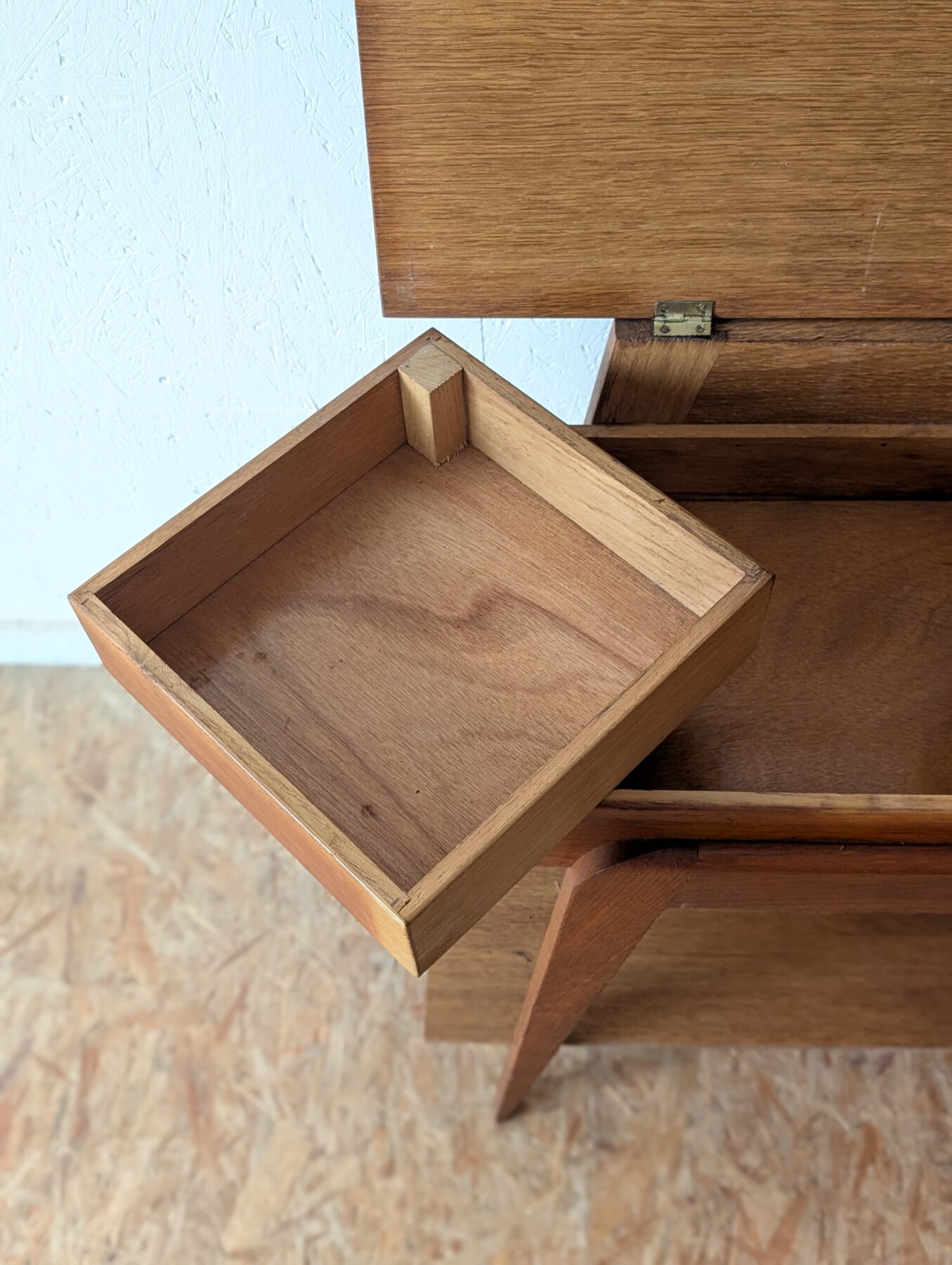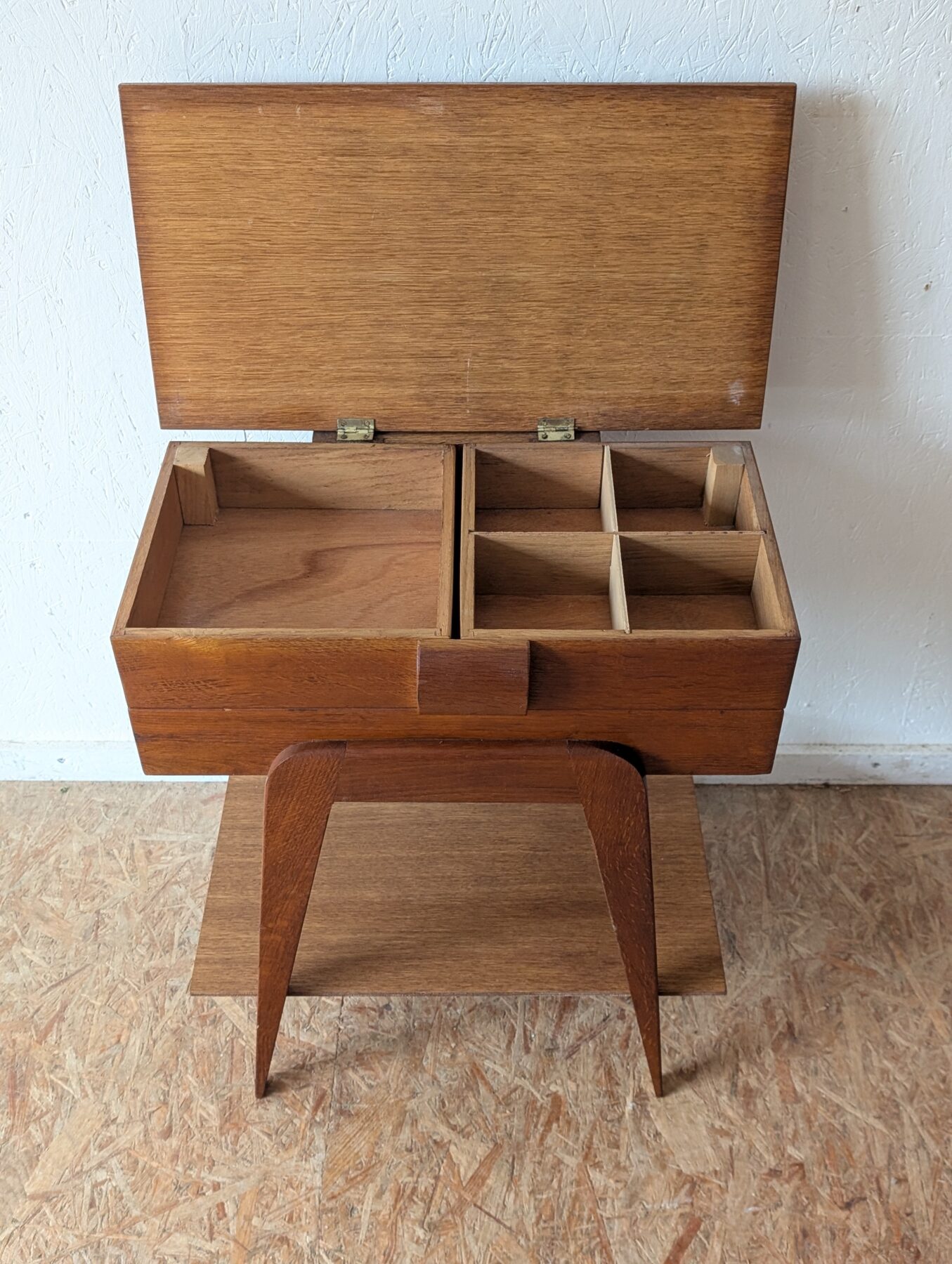 Travailleuse en chêne pieds compas vintage avec plateau ouvrant et casiers déployables. Idéale aussi en table d’appoint ou chevet.